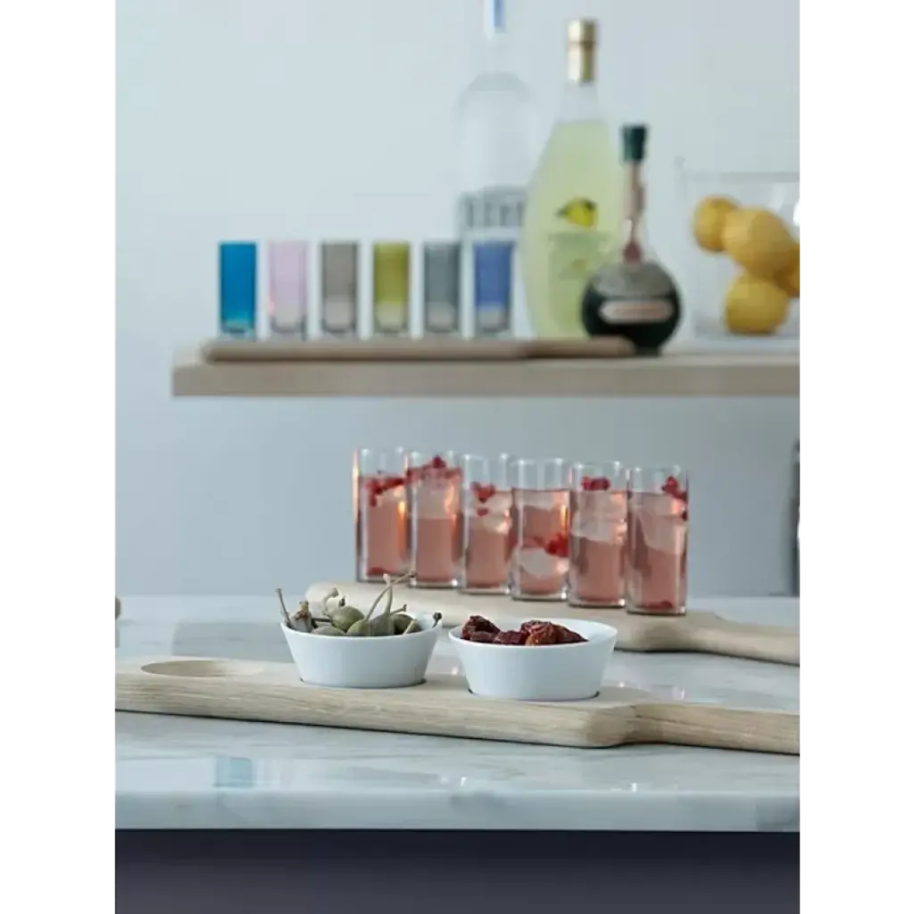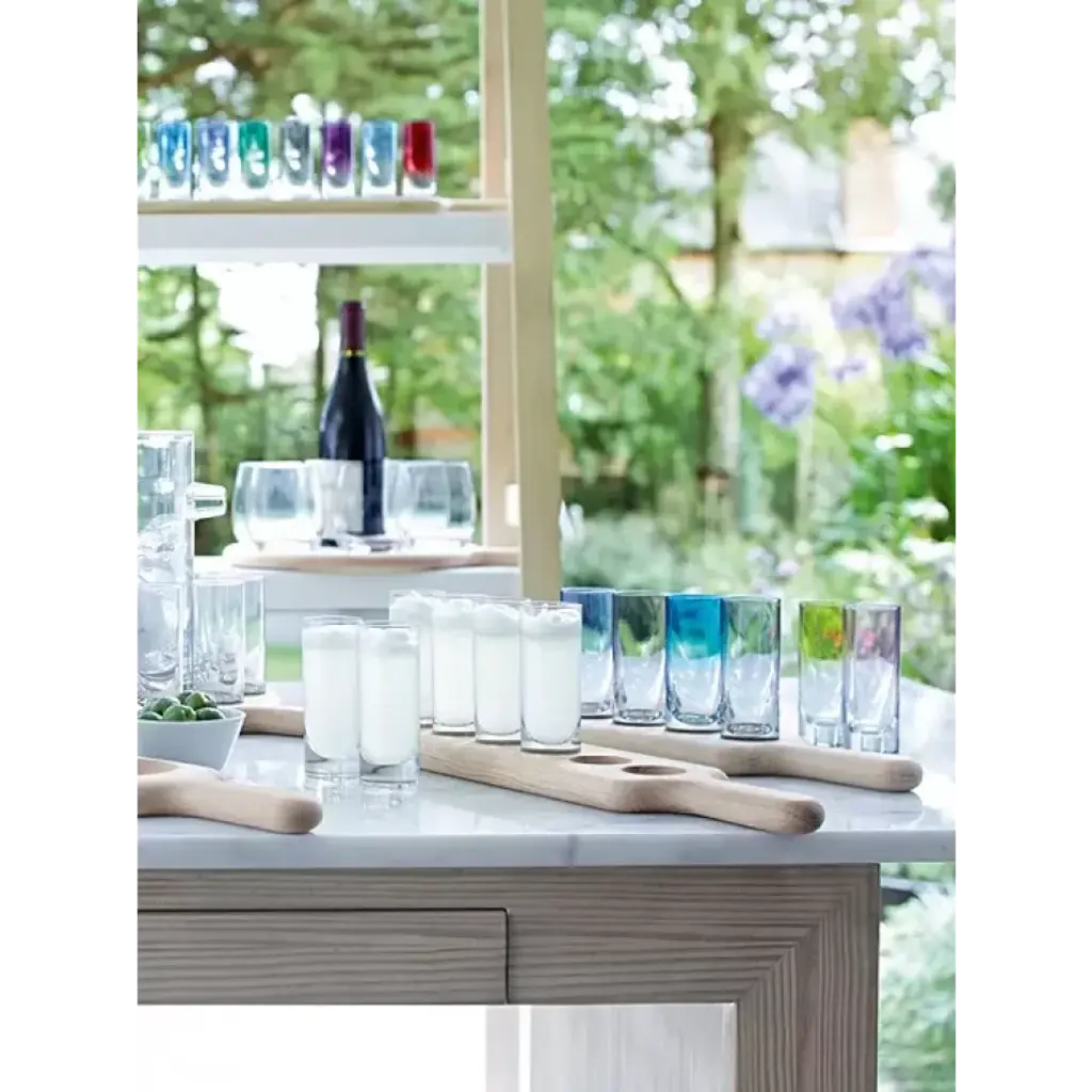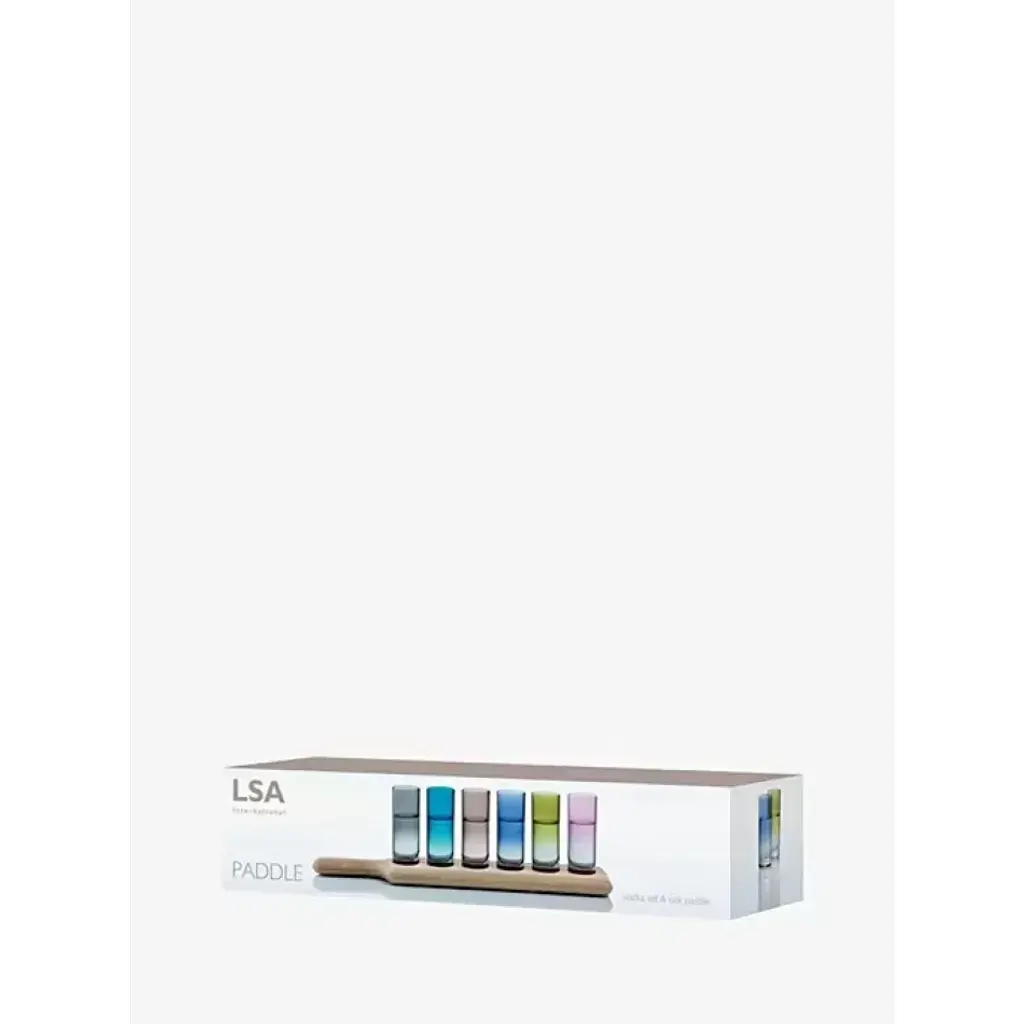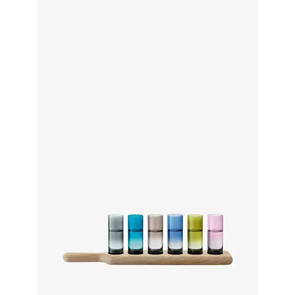 A mixed material party set. Six ombre-coloured shot glasses nestle securely along the length of the natural oak board. The paddle has slim handles at either end. For serving vodka, tequila and other spirits. Natural FSC®-certified oak paddle Hand-finished wood Six tall shot glasses Colour on glass fades from rim to base Photographic packaging