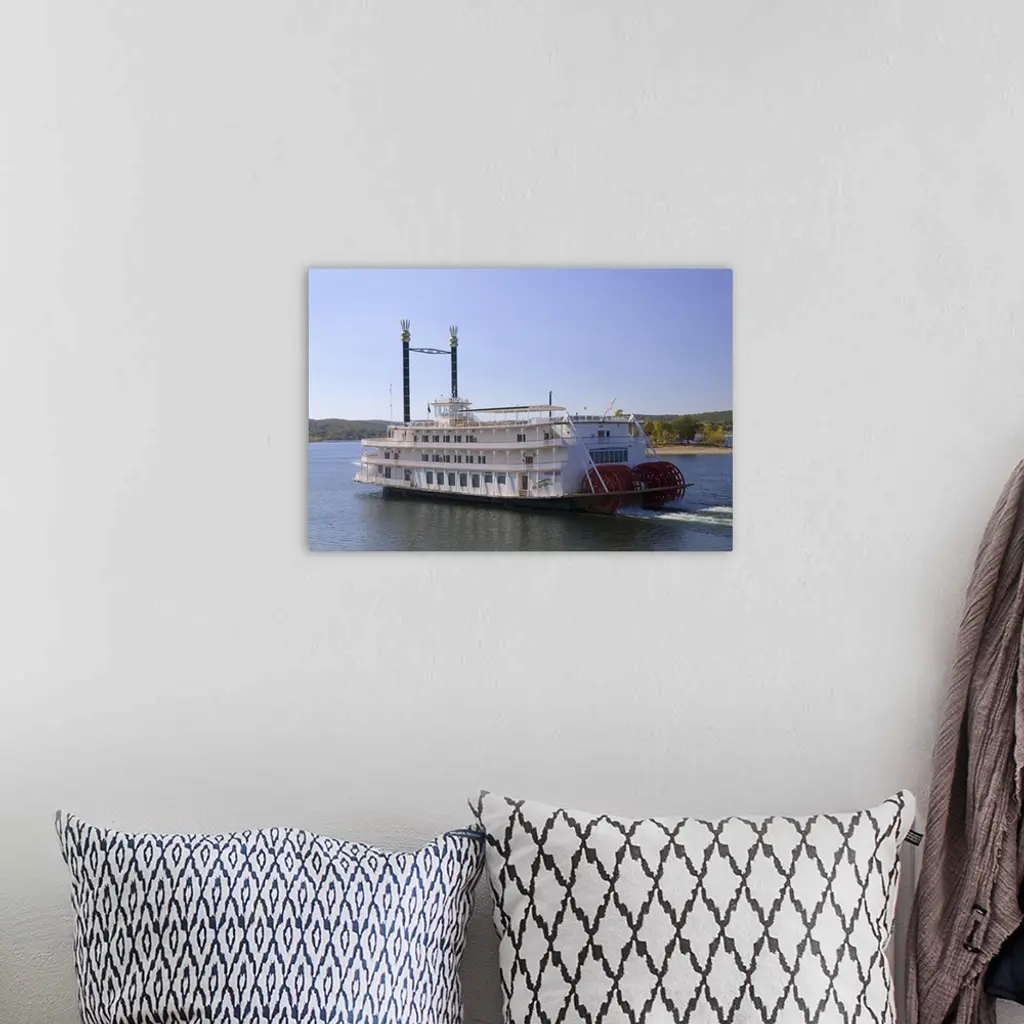 Paddleboat moving in a lake, Showboat Branson Belle, Lake Taneycomo, Branson, Missouri wall art for home and office decor. Discover canvas art prints, photos, mural, big canvas art and framed wall art in GreatBigCanvas.com's varied collections.
