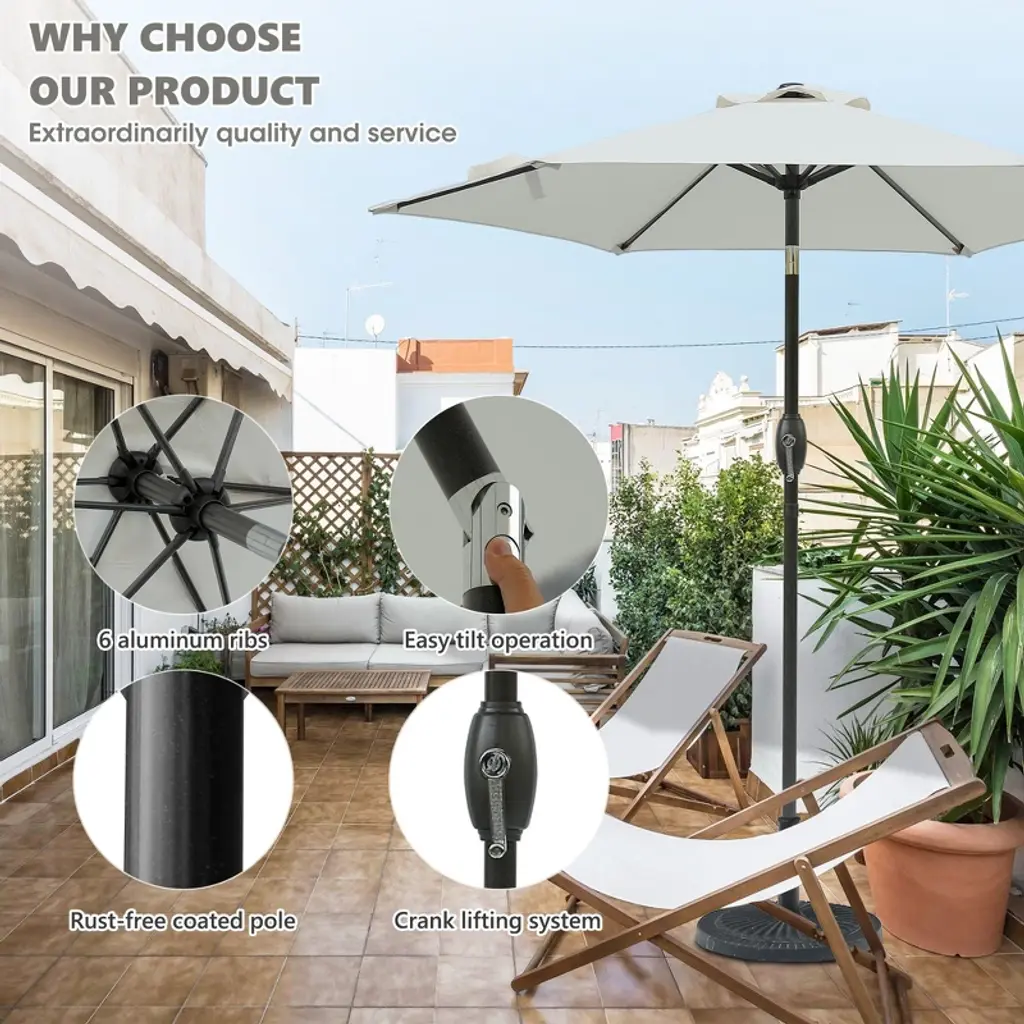This patio umbrella combines upgraded materials with practical design, featuring a durable water-resistant polyester canopy that offers UV protection and fade resistance.The powder-coated heavy-duty steel pole and six ribs ensure rust resistance and long-term durability in various weather conditions.A user-friendly crank system allows effortless opening/closing, while the push-button tilt adjusts the canopy for optimal sun protection.