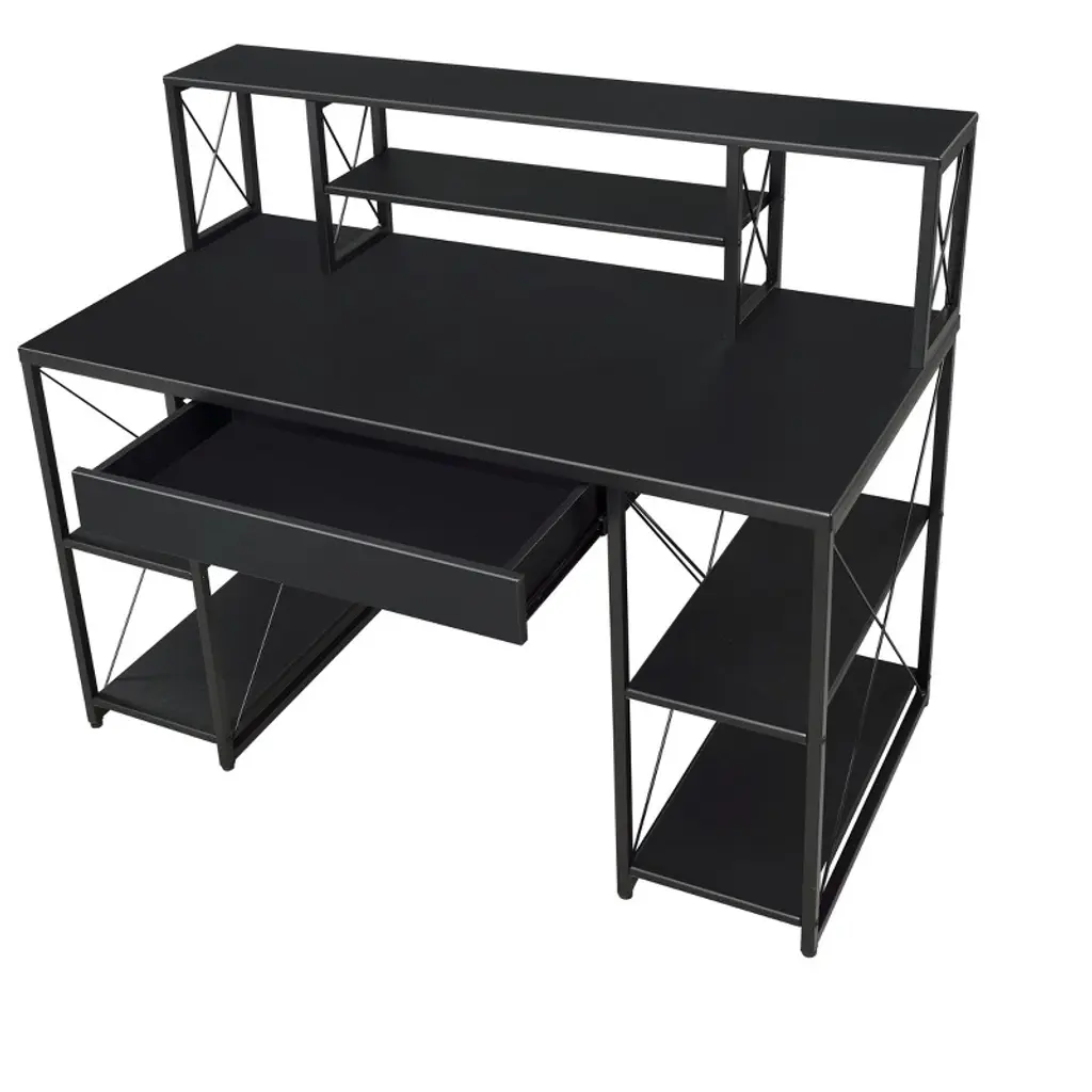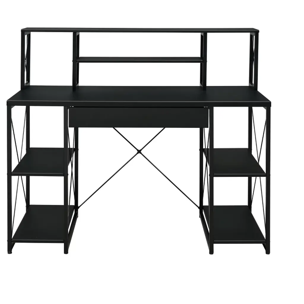 The combination of wooden desktop and metal frame is simple and elegant, without any extra decorative patterns or words, creating an industrial style. The desk frame is made of high-quality metal material, with excellent load-bearing capacity and excellent stability, ensuring that users enjoy a safe and comfortable use experience during use. At the same time, the desktop provides a spacious rectangular desktop for users to place computers, books, stationery and other office necessities. In addition, there are four shelves below, which can flexibly adjust the space for storing items to meet users' diverse storage needs.