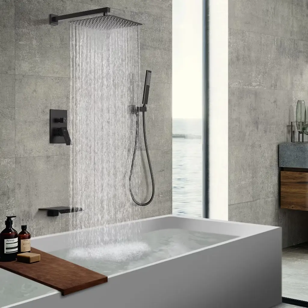 This premium 3-in-1 shower system seamlessly integrates a rainfall showerhead, handheld sprayer, and waterfall tub spout for ultimate bathing versatility. The advanced air-injection technology boosts water pressure up to 2.5 GPM, delivering a powerful spray even in low-pressure plumbing systems, while the pressure-balance valve ensures consistent, safe water temperature by preventing sudden fluctuations. Compatible with standard NPT 1/2" connections, it installs effortlessly in most bathrooms without requiring special adapters. The complete installation kit includes all essential components—shower arm, handheld unit, hose, and wall mount—for quick, hassle-free setup. Combining spa-like luxury with practical functionality, this system offers multiple showering experiences from full-body rainfall to targeted rinsing, all in one space-saving design.