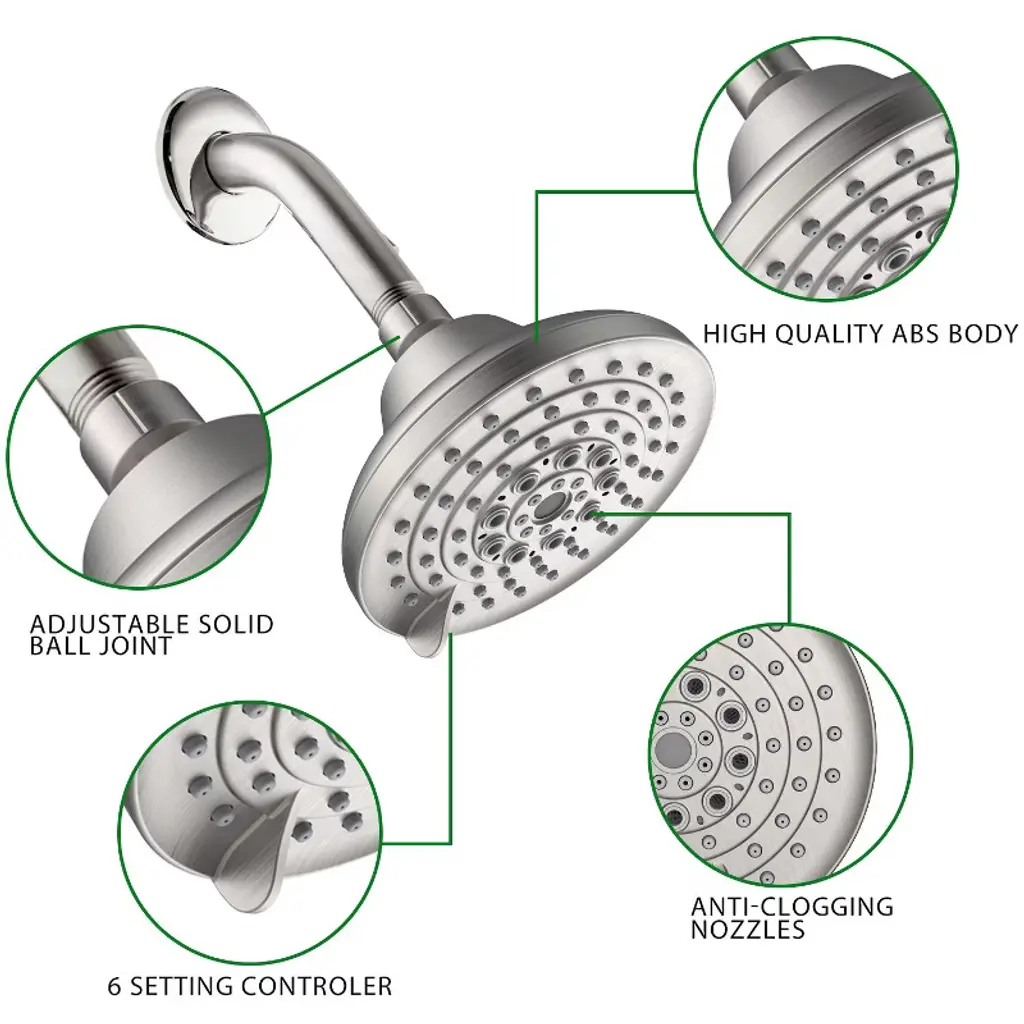 Paged High Pressure Showerhead Fixed Rain Shower Head With 6 Spray Settings For Bathroom, Restroom, Silver And Gray