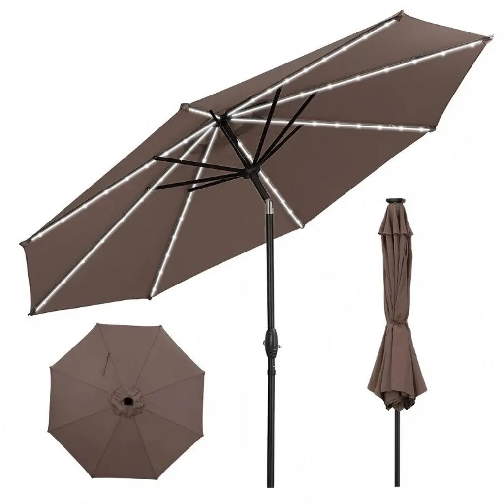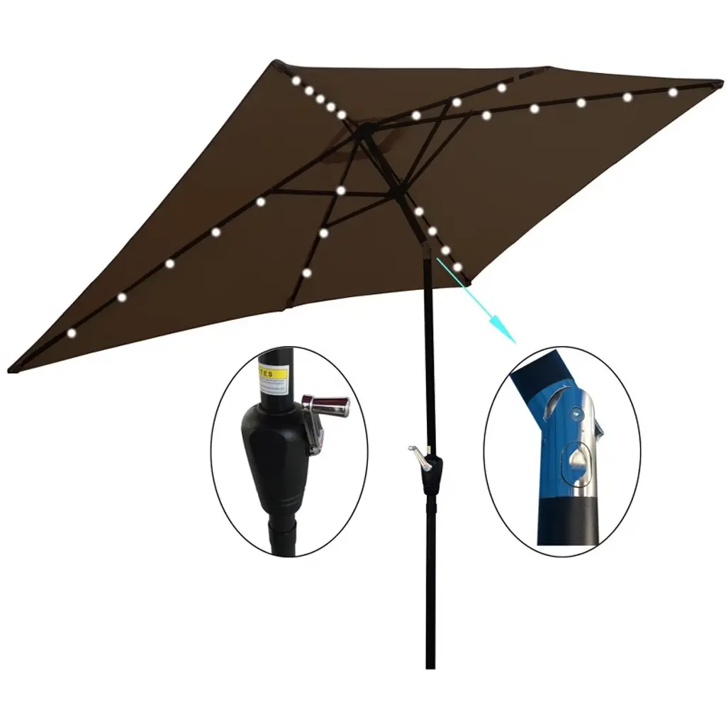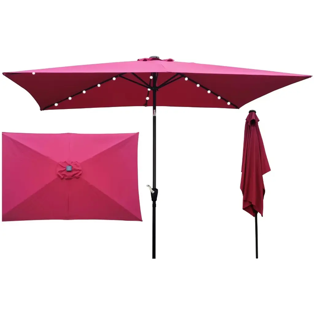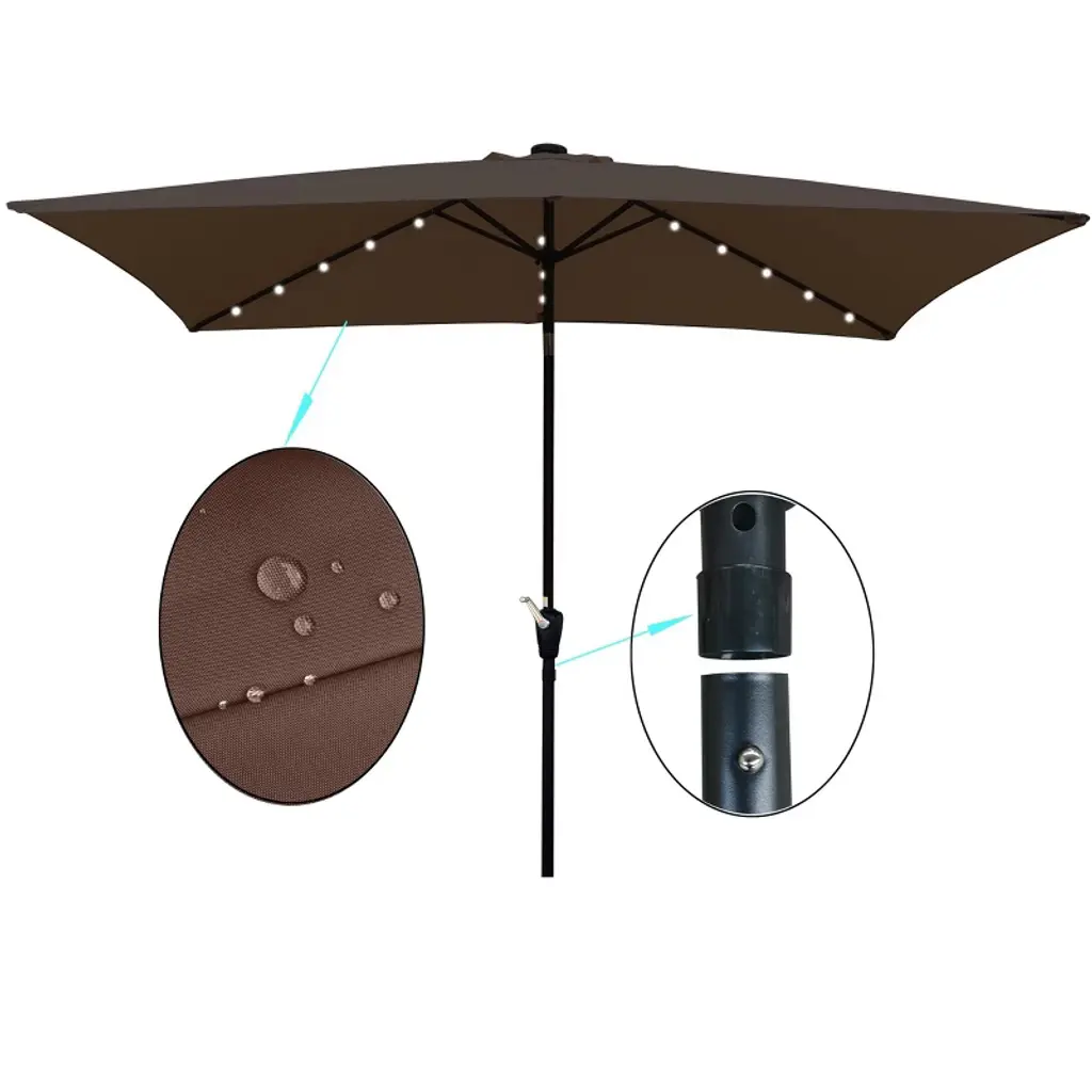 This rectangular patio umbrella combines durability with solar-powered illumination, featuring a 100% polyester waterproof canopy that resists fading and is easy to clean.A user-friendly crank system allows smooth opening and closing, and push-button tilt technology effortlessly adjusts the canopy to block the sun at any angle.Ideal for gardens, swimming pools, or outdoor gatherings, this umbrella balances practical sun protection with ambient lighting, though it’s recommended to close during inclement weather (base not included).