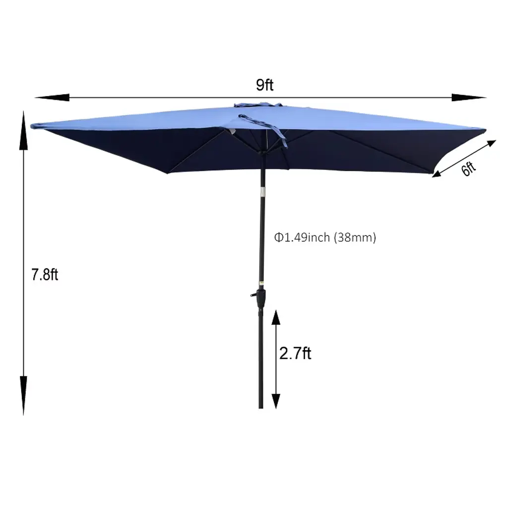 This rectangular patio umbrella combines durability with functional design, featuring a waterproof polyester canopy that resists fading and is easy to clean.The rust-free powder-coated steel pole and six heavy-duty square ribs ensure sturdy support, while the vented top enhances air circulation to keep you cool on hot days.A user-friendly crank system allows smooth opening/closing, and push-button tilt technology adjusts the canopy for optimal sun protection at any angle.