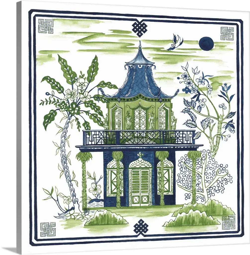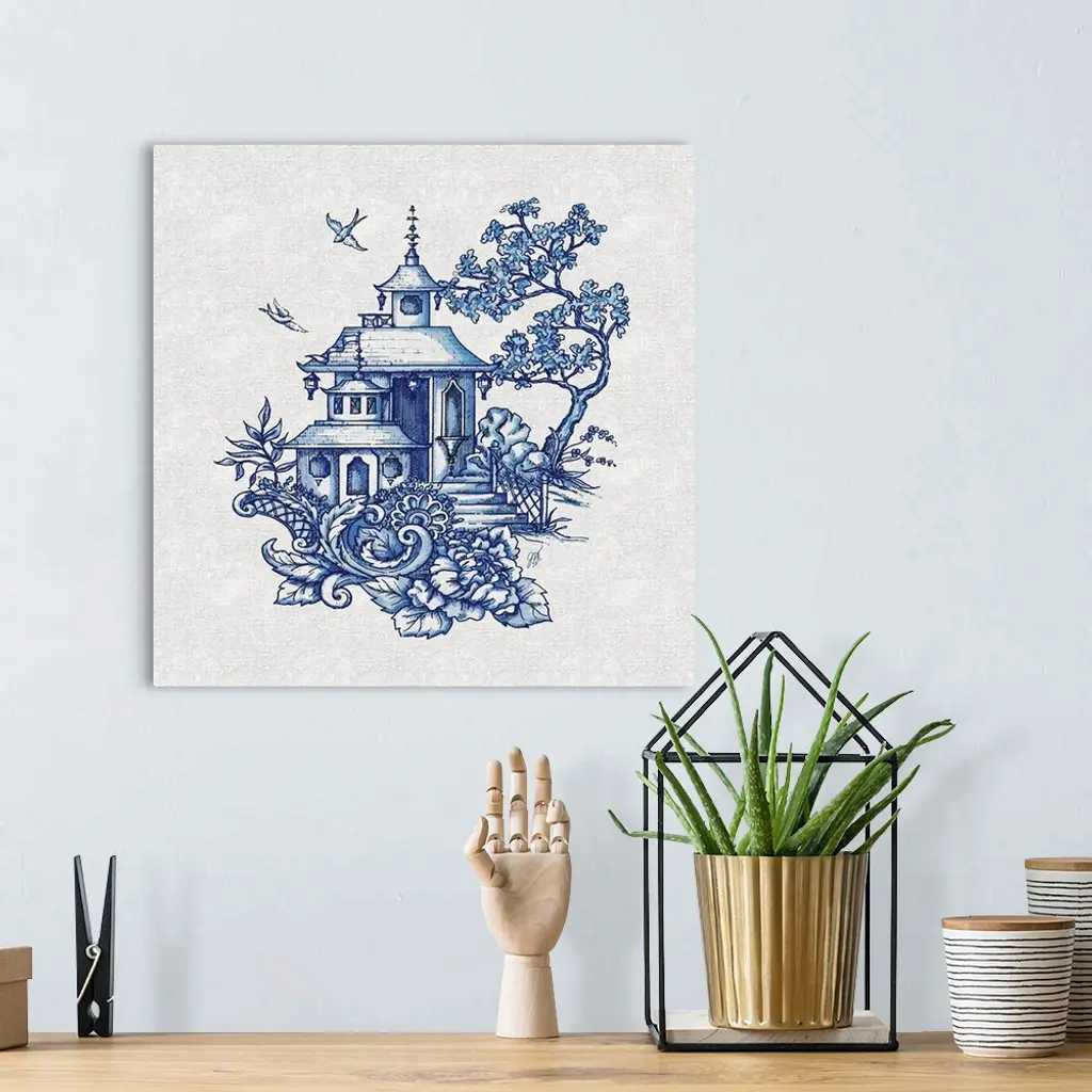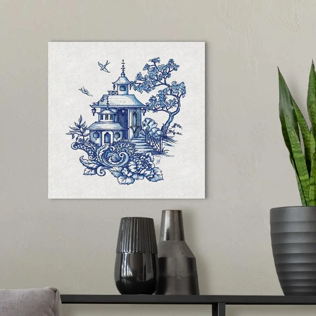 Chinoiserie featuring a pagoda with birds in flight in blue over a linen background.