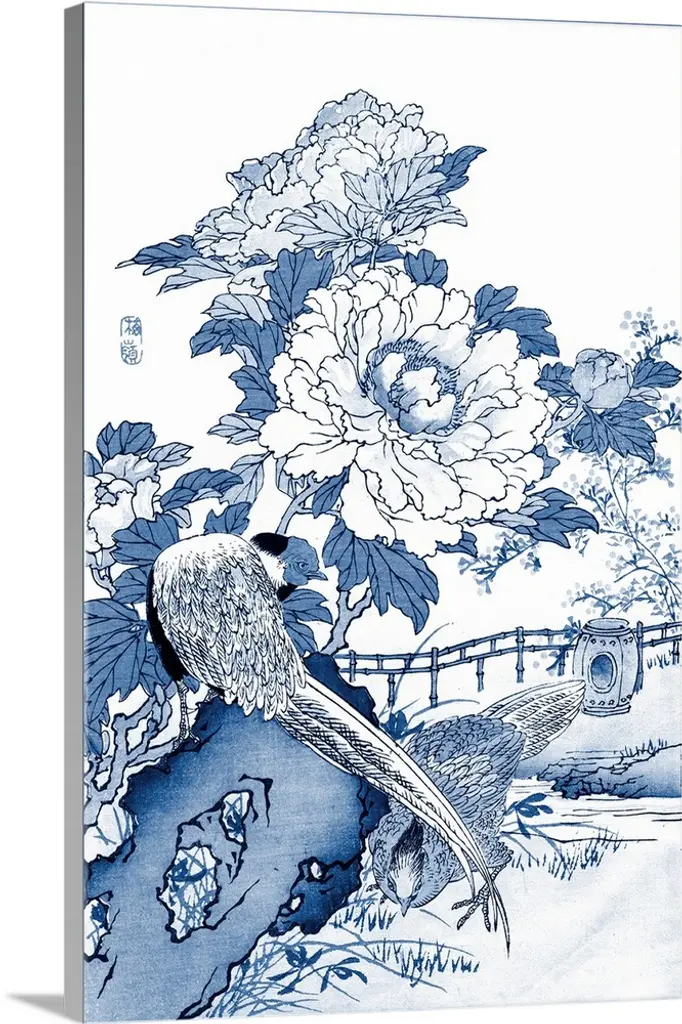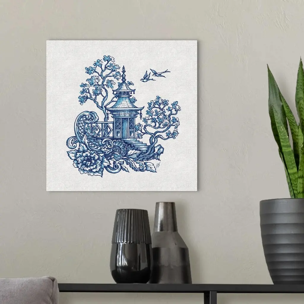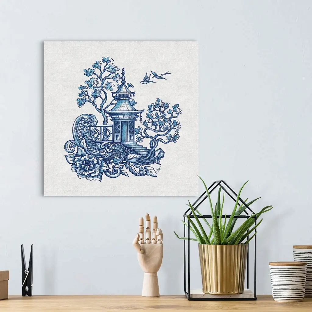 Chinoiserie featuring a pagoda with birds in flight in blue over a linen background.