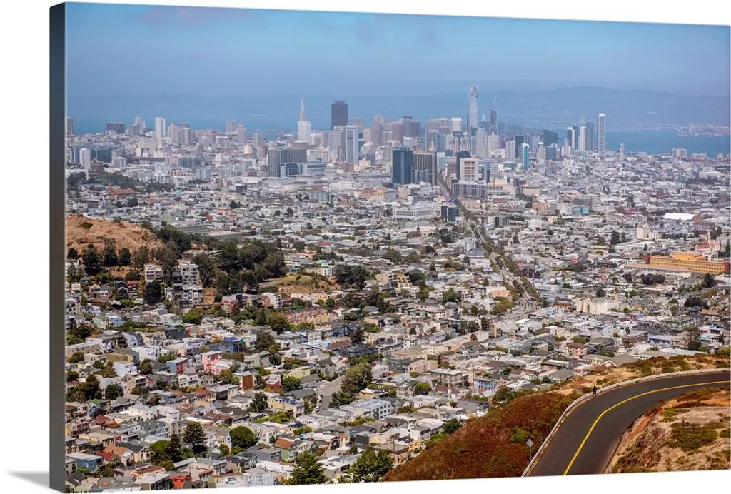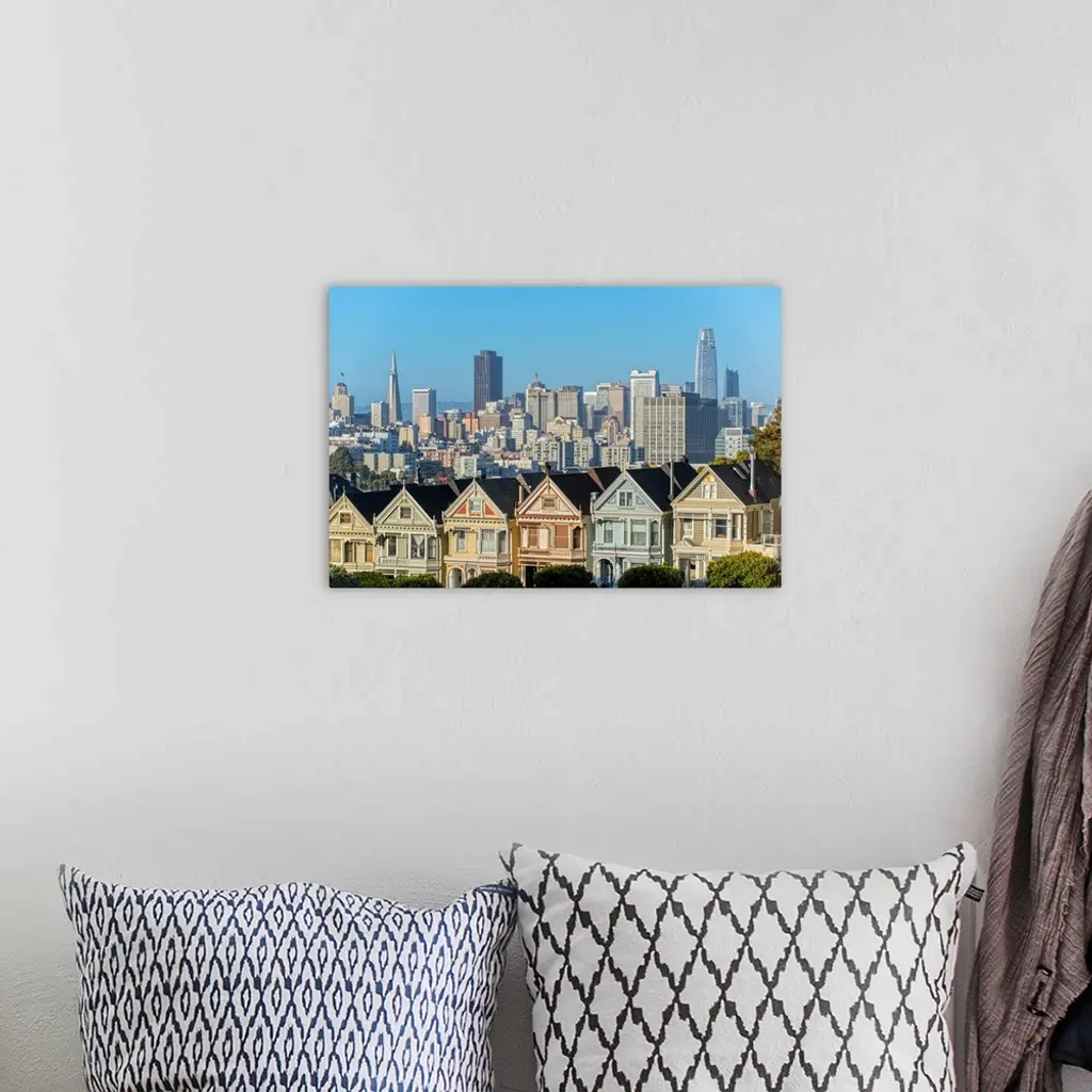 Photograph of the Painted Ladies in downtown San Francisco with tall buildings in the background.