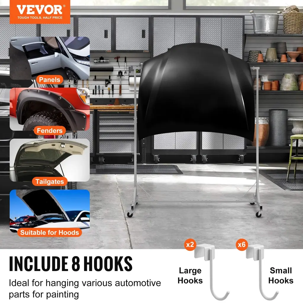 Sturdy Adjustable Hooks: With 2 large and 6 small hooks, this painting rack can easily hold up to 66 lbs / 30 kg of car parts for painting or drying. Adjust the hook positions as needed. They are simple, flexible, and ideal for any task. Adjustable Rack for Flexibility: Need different sizes? This painting hanger rack can reach up to 79.1" / 2010 mm in height and extend up to 70.9" / 1800 mm in length. You can adjust height by 21.2" / 540 mm and length by 12.6" / 320 mm for a custom fit, making your painting tasks more efficient and flexible. Smooth and Secure to Move: This painting drying rack has 3-inch swivel casters and two brakes for stability. You can move it around securely and smoothly without worrying about stability. Heavy-Duty Steel Construction: Made with durable steel and coated with a powder finish, this paint rack is made to last through all your painting jobs. It is strong and reliable for everyday use. Quick and Easy Setup: Set up in just minutes! You'll be ready to paint hoods, doors, fenders, and more in no time. Package Content 1 x Painting Rack 8 x Hooks 4 x 3 Inches Swivel Casters (2 with Brakes) 1 x Set of Screws and Nuts 6 x Diagonal Braces 1 x User Manual