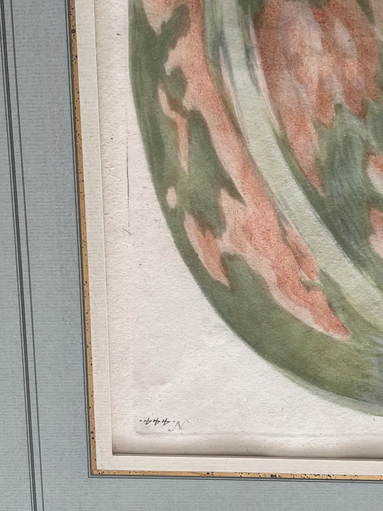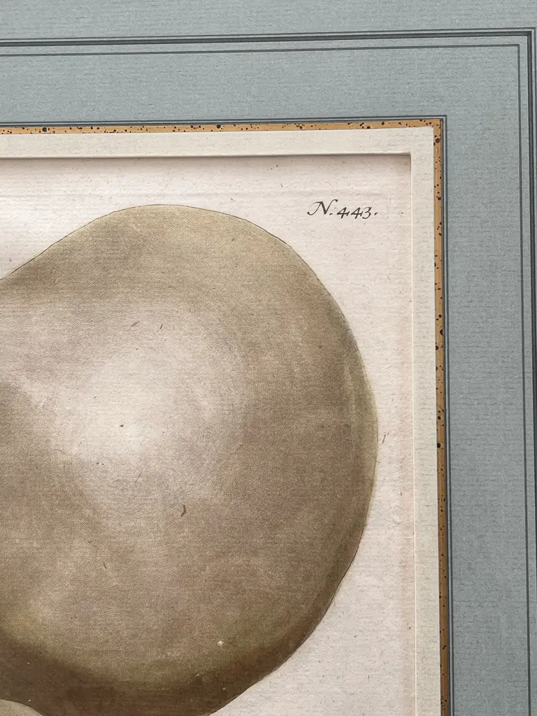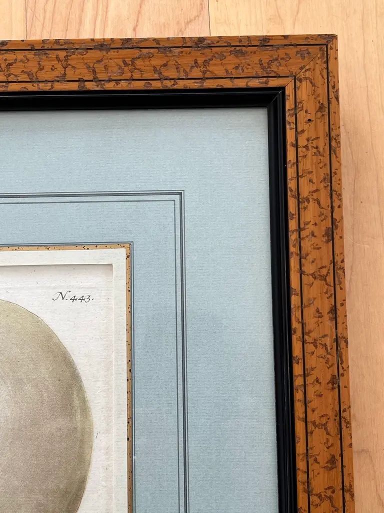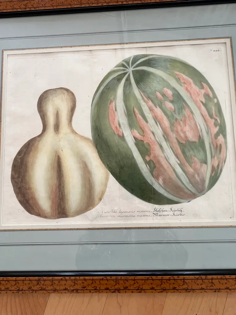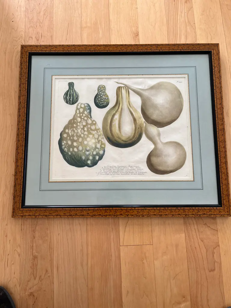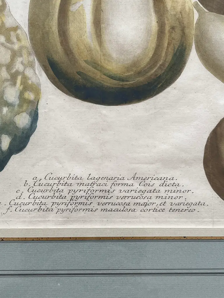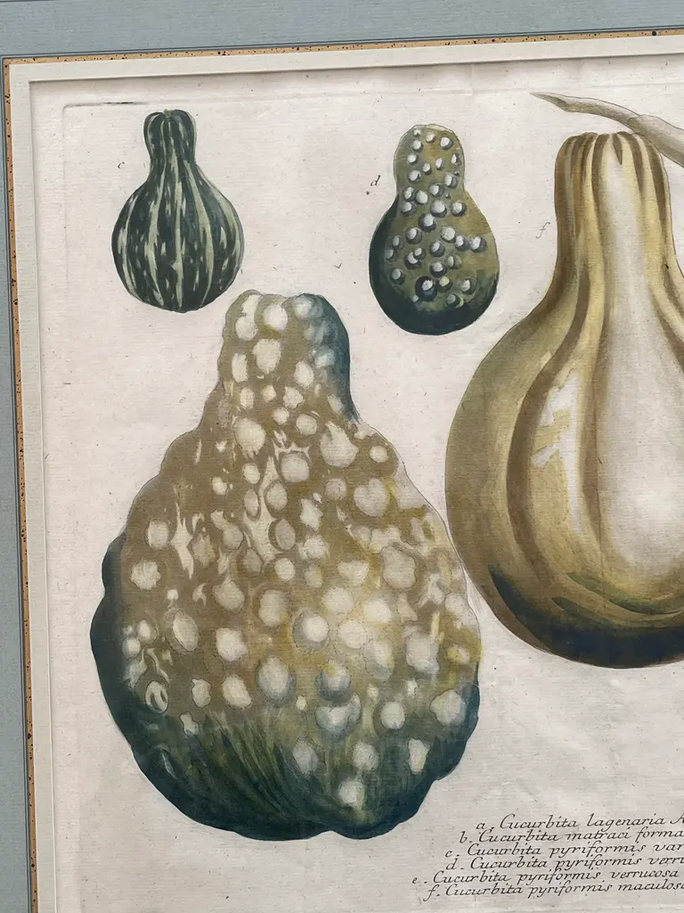 Just in time for fall two beautifully framed and matted botanical engraving of gourds with Latin descriptions and plate numbers possibly French, light blue French Matte probably framed fairly recently but engraving date from around 1850