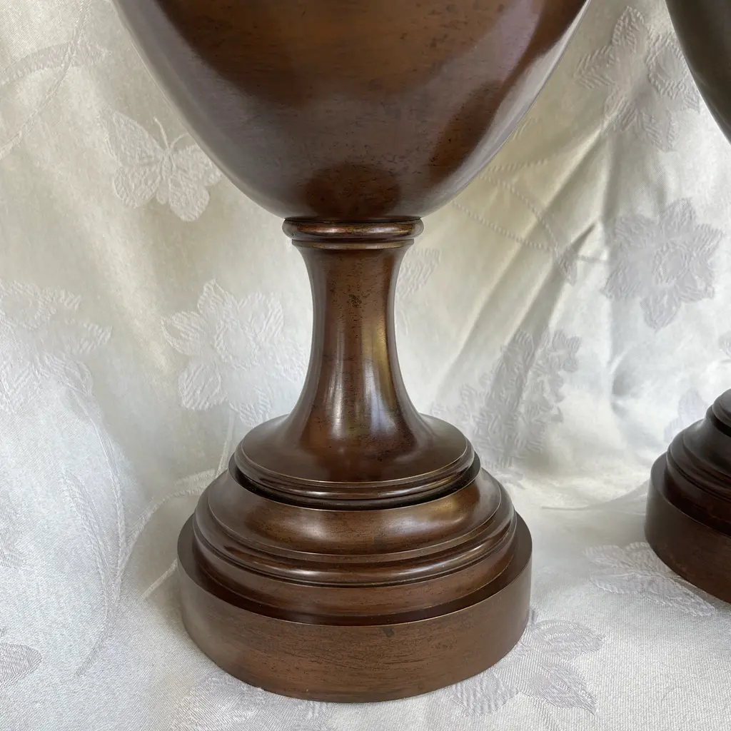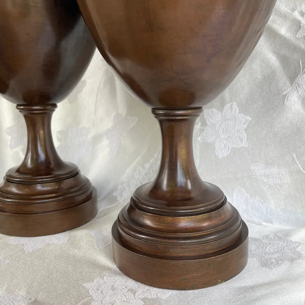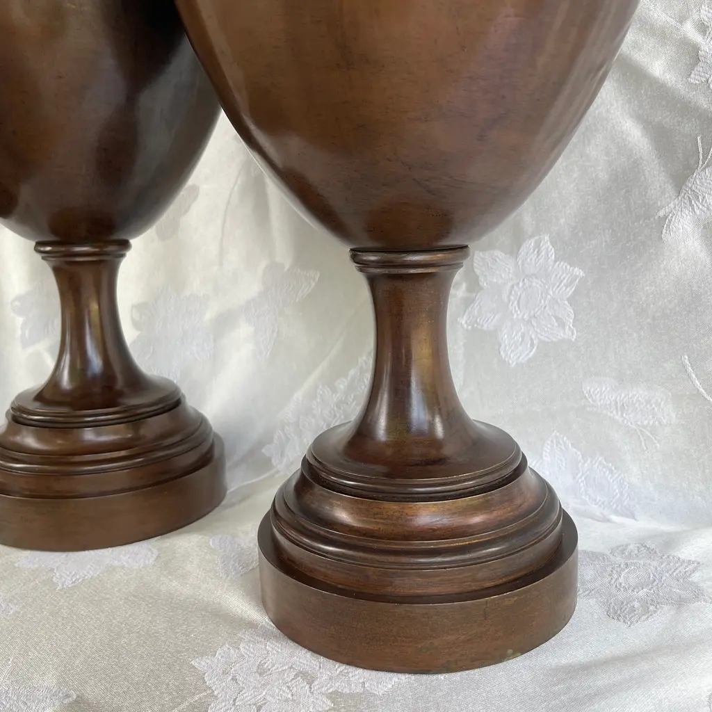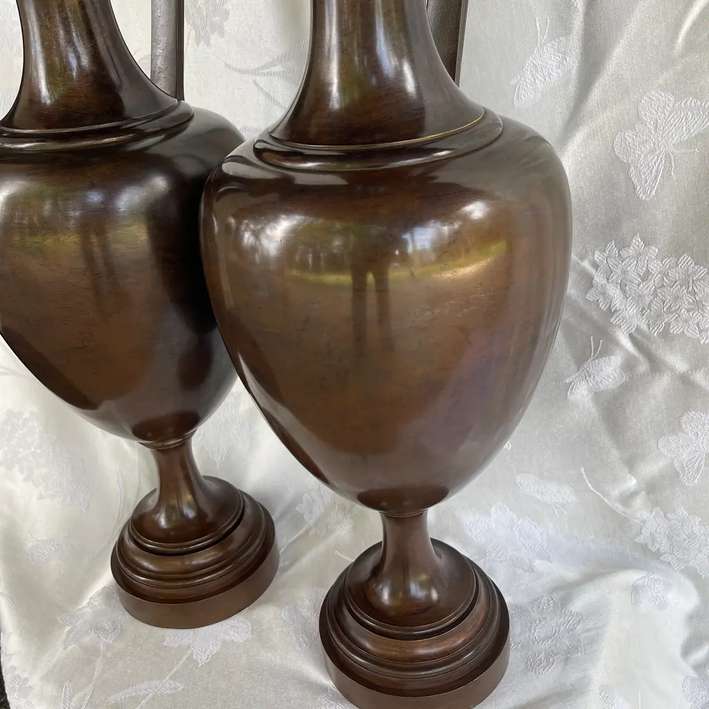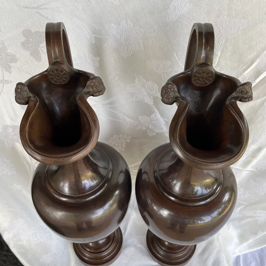 Beautiful pair of very large (28") bronze antique Neoclassical urn shape ewers widening in the middle and tapering towards the base and neck. The prominent handle depicts an architectural medallion with two Roman heads. Each ewer weighs 24 pounds. I don't know exact age, but I would date them around the late 19th century or early 20th century. They are in excellent condition considering their age with minor nicks. They have been cleaned and polished (ready to be displayed in your home).
