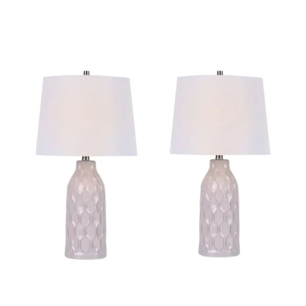 The 24in. Honeycomb/Highlighted Edge Ceramic Table Lamps in a Distressed White Finish are sure to instantly charm. Attention to detail can be found in the striking look and stunning design that will add a subtle Transitional flare to your favorite space. The White finish was created to seamlessly compliment the most desired finishes found in homes today! Lamp includes a designer shade made in a décor friendly tone of white. Light comes complete with an easy to use on/off switch. This item takes 1 bulb with a maximum wattage of 100 (Not Included.) Lamp is UL and CSA Listed. Showcase your discerning tastes brilliantly with this item. The stylized, Honeycomb look possesses its own presence while illuminating your exquisite decorating tastes. If you enjoy the graceful lines of Transitional designs, this is the lamp for you! Bring this item home! You will be glad you did!