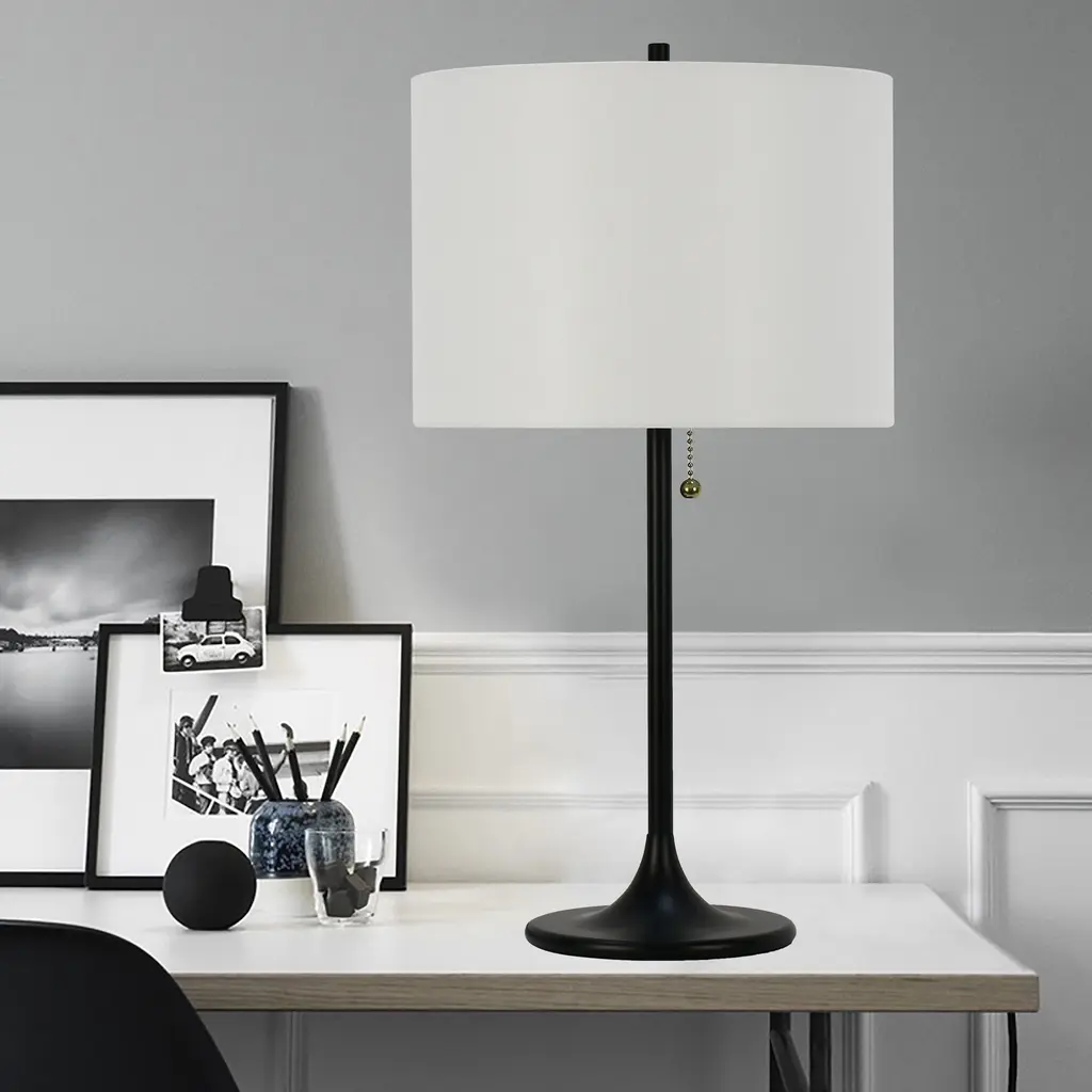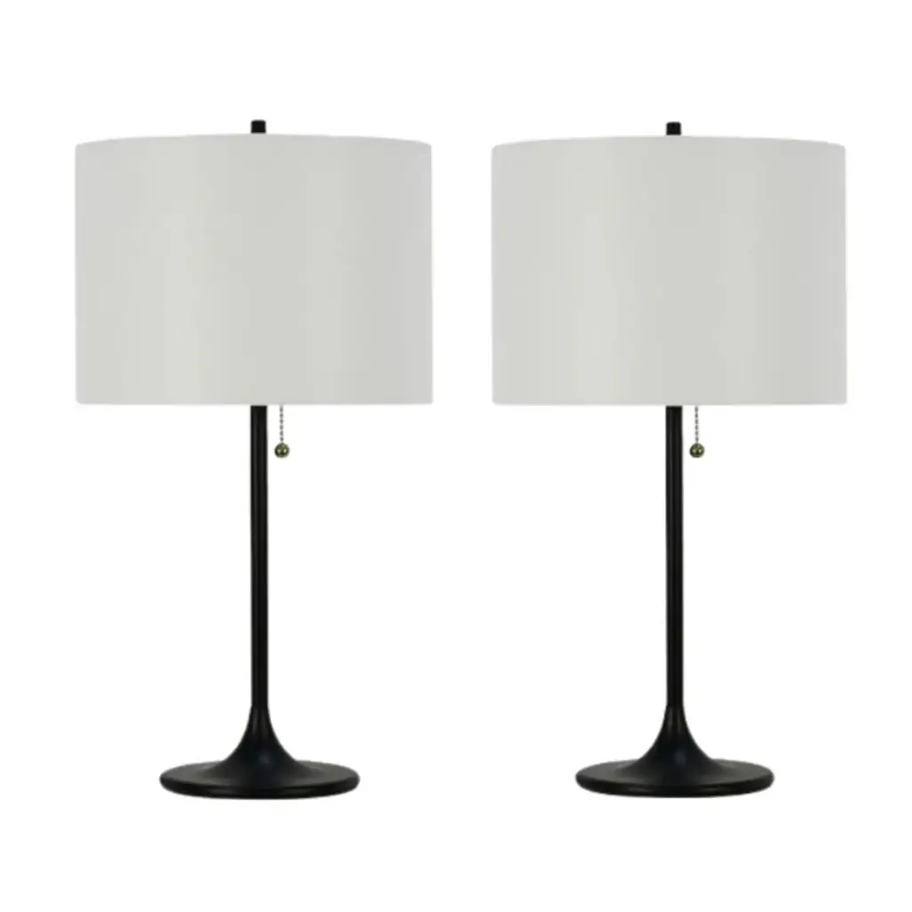 This pair of 26.5" metal European design table lamps are shown in black. Their styling and finish will coordinate with transitional furnishings to work in every room. Showcase your brilliant tastes through this simple chic look with elongated trumpet flair base while accenting your favorite decor. The white linen shade is a perfect compliment. The lamps come with an easy pull chain switch, use one 100W bulb (not included), and are UL & CSA listed.