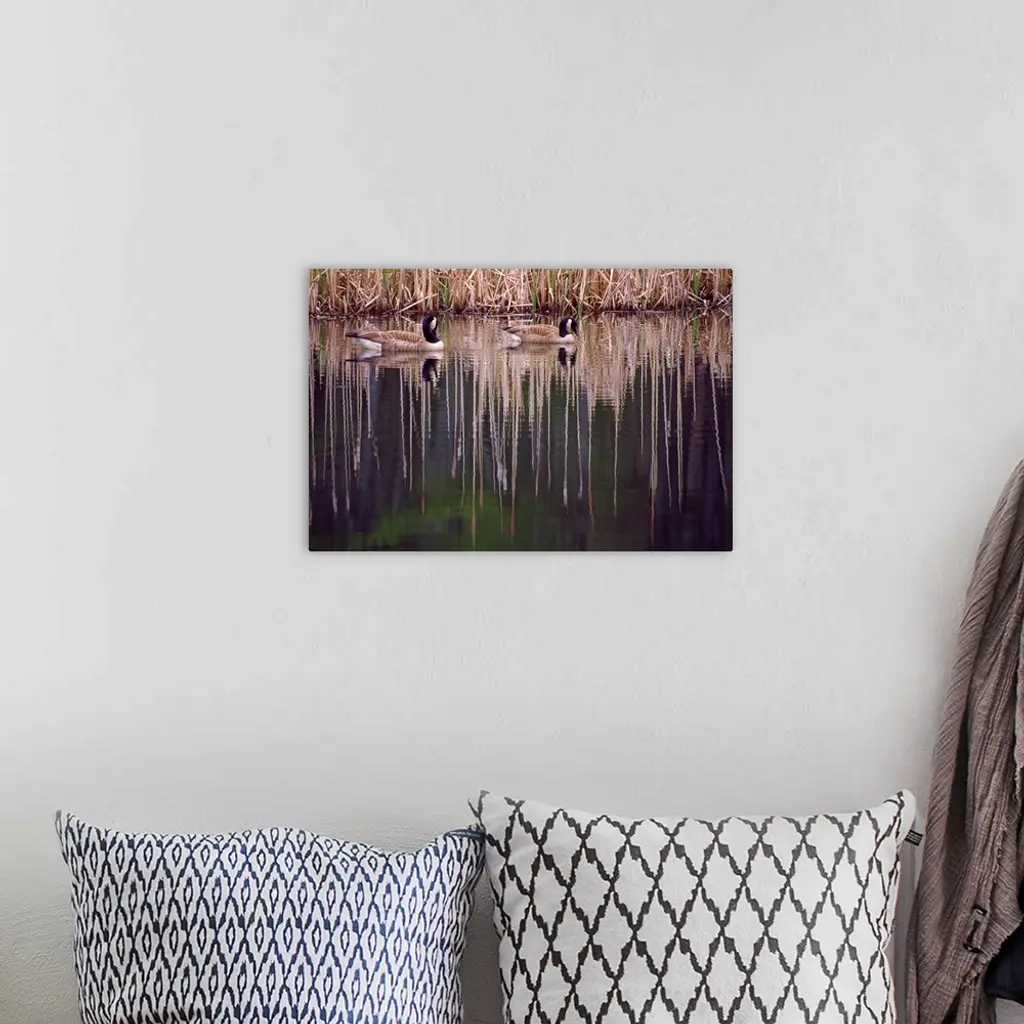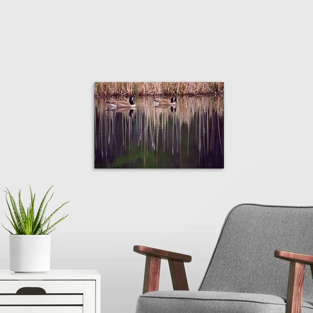 Pair Of Canada Geese On Still Water wall art for home and office decor. Discover canvas art prints, photos, mural, big canvas art and framed wall art in GreatBigCanvas.com's varied collections.