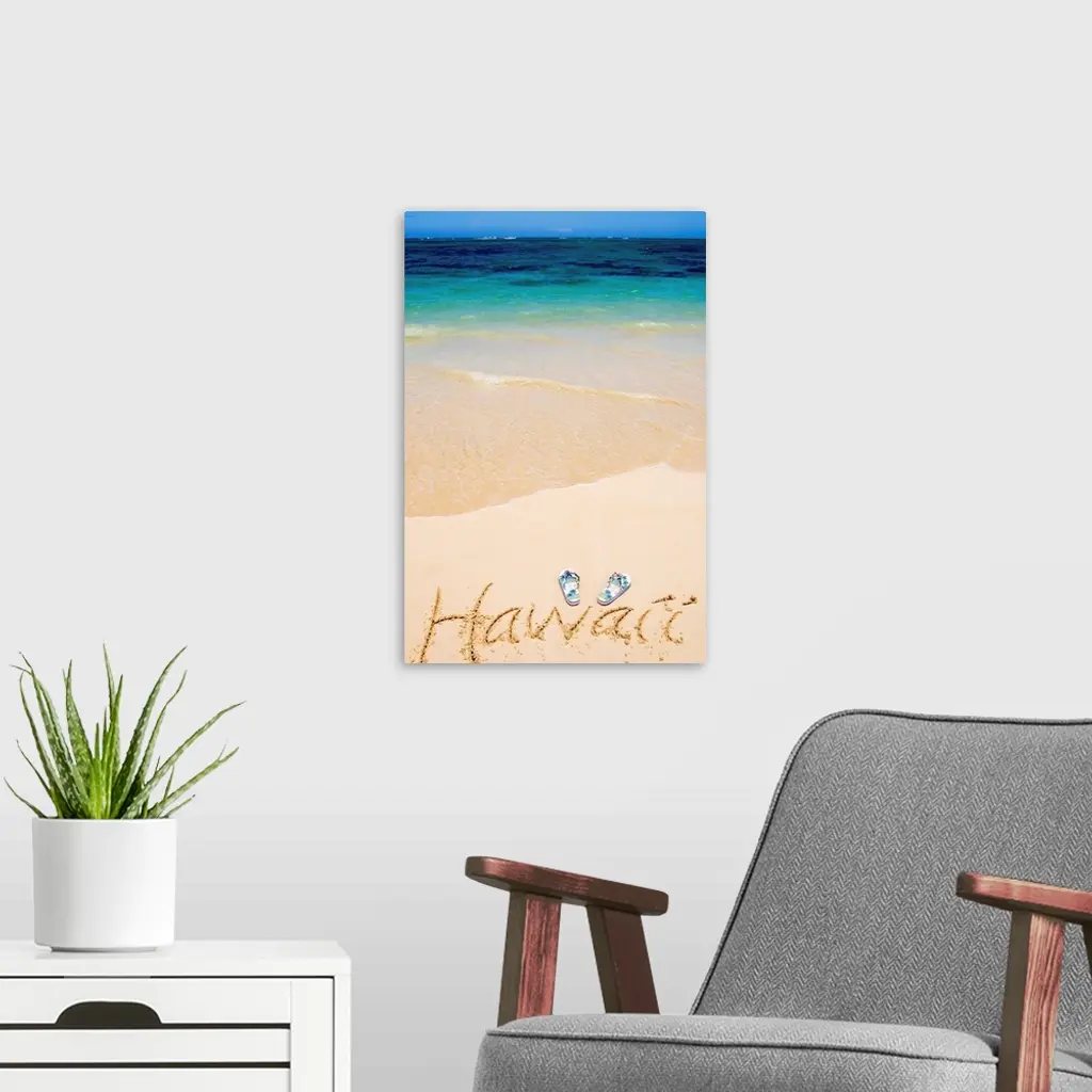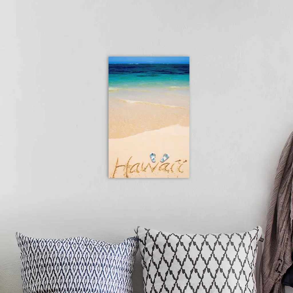 Pair Of Flipflops And Hawaii Written In The Sand, Gorgeous Blue Ocean wall art for home and office decor. Discover canvas art prints, photos, mural, big canvas art and framed wall art in GreatBigCanvas.com's varied collections.