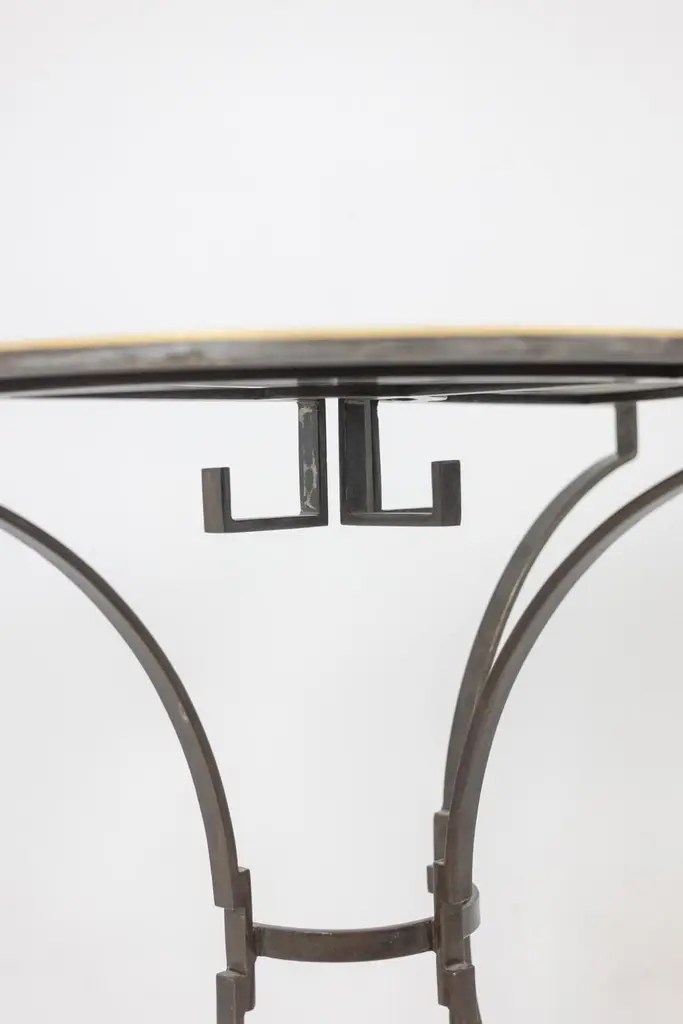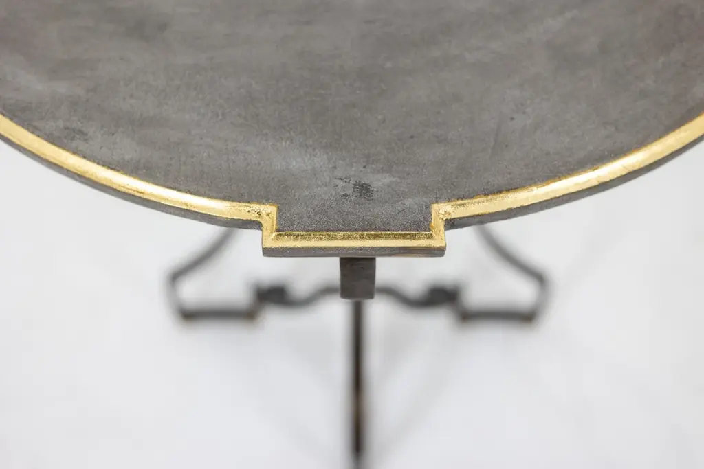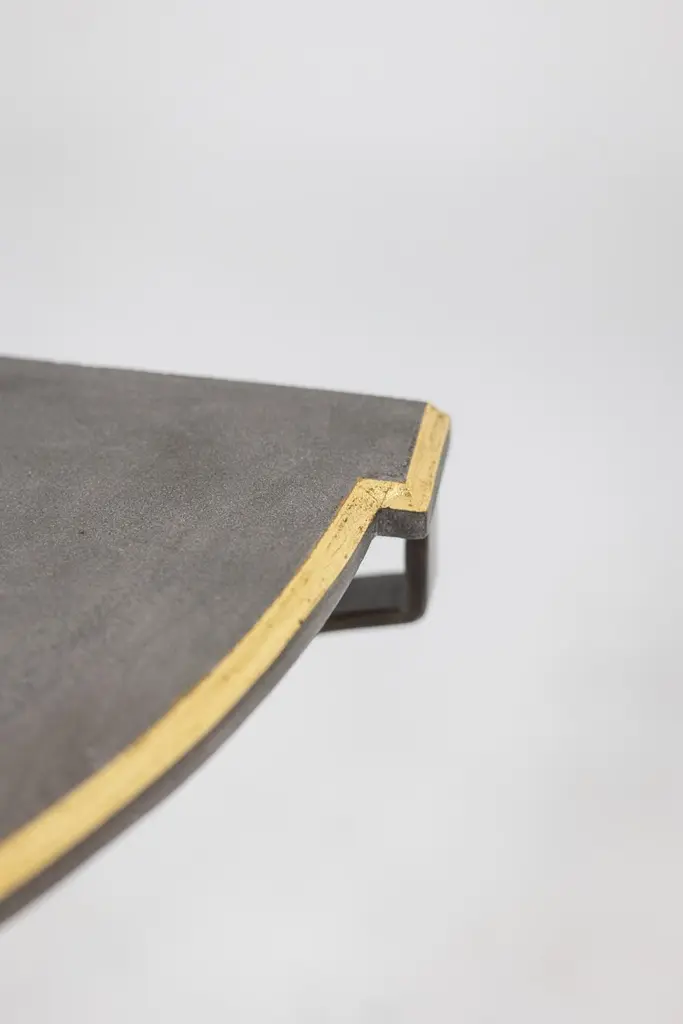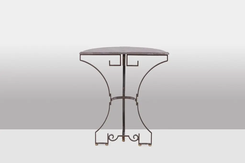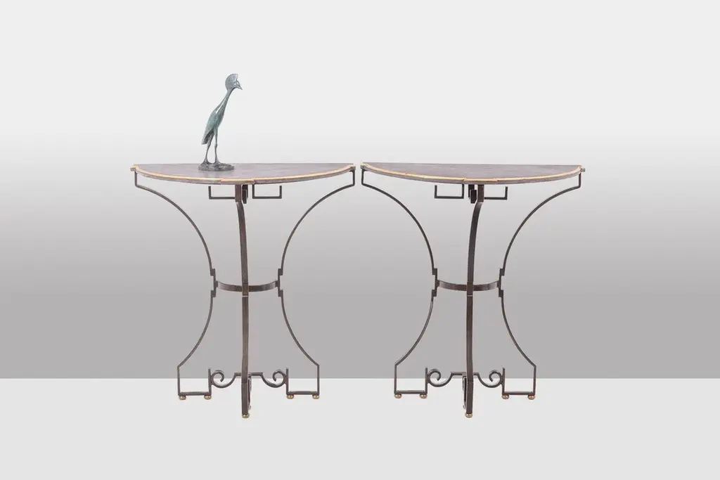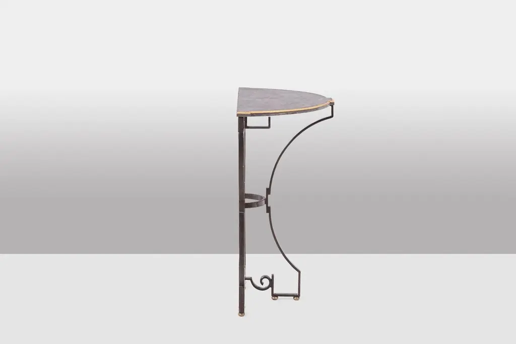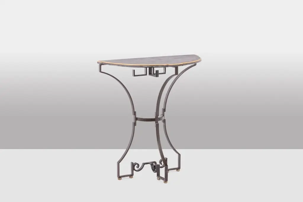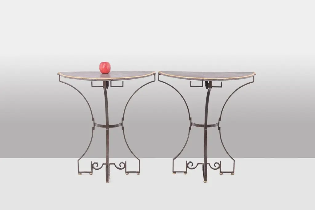 Pair of half-moon shaped consoles, the polished concrete top resting on a patinated metal base, gunmetal finish.Unique pieces.Work of French craftsman.Possibility of buying a console alone at the price of 3400 euros. Please contact us. Dimensions: H 73 x W 67 x D 33,5 cm