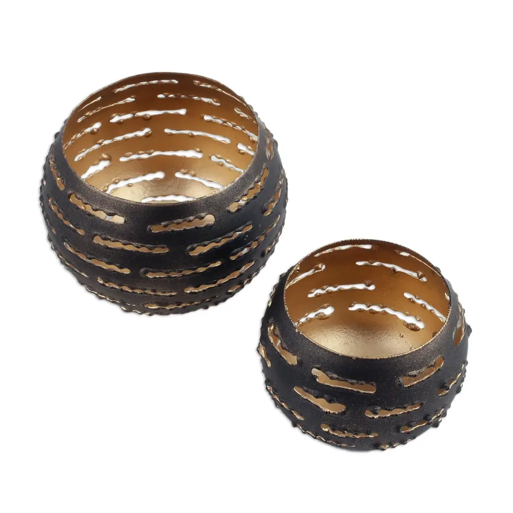 Steel sheet is crafted by hand into two globe shapes that are elaborated with slatted openwork. Arti Sharma presents a charming pair of tealight holders, featuring a small and large one. Perfect for display side-by-side or separately, these tealight holders bring a wonderful glow to any space.