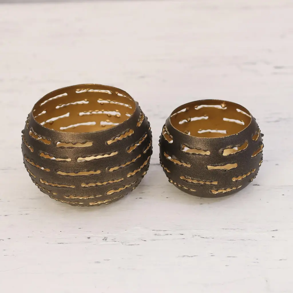 Pair Of Handcrafted Steel Tealight Holders From India- Slatted Glow