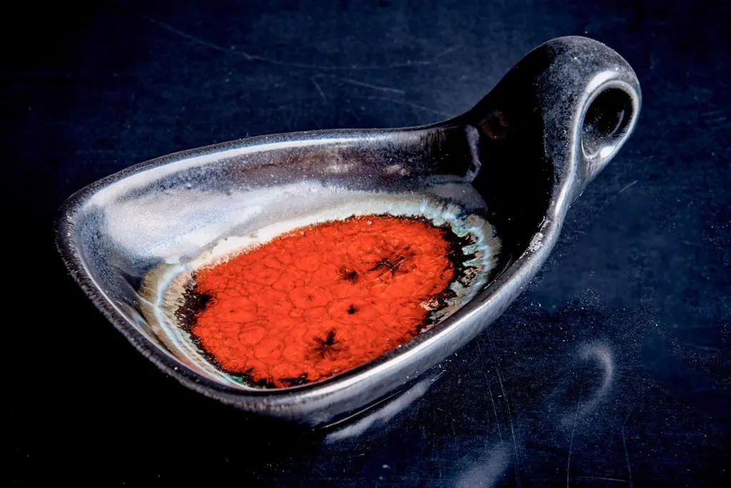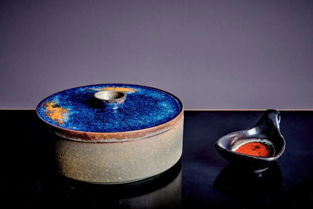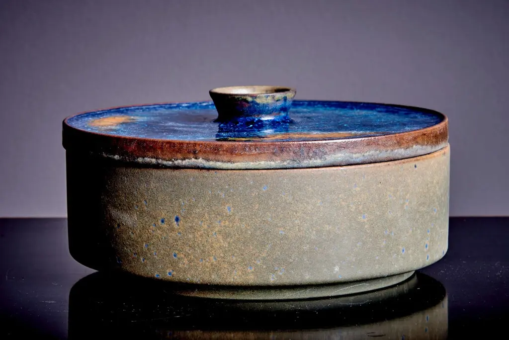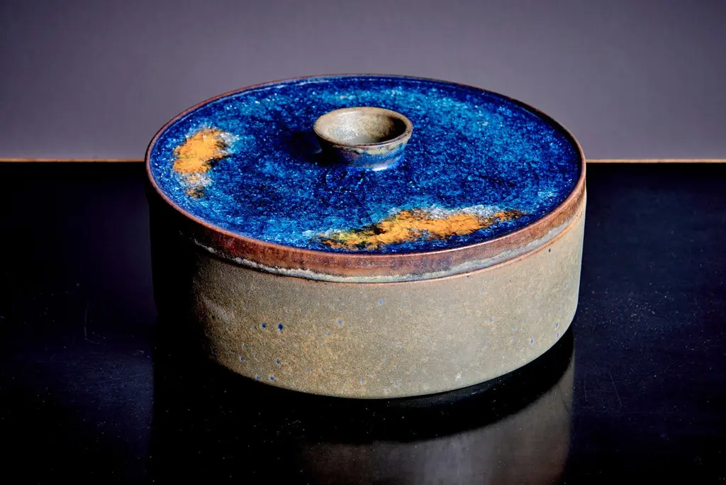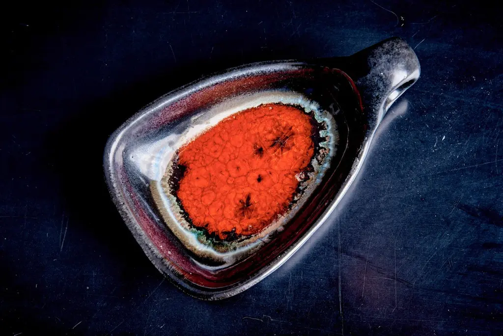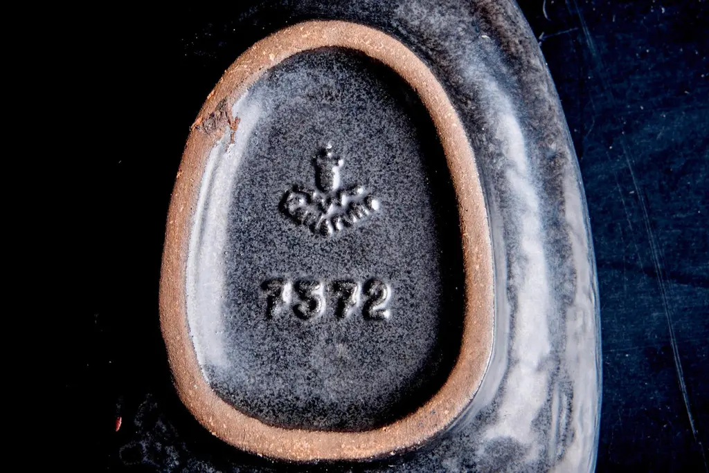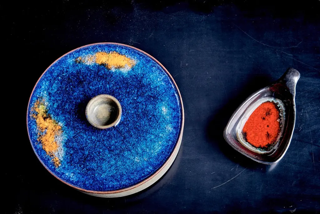 Nice pair of 1960s Majolika ceramics, known for bold glazes and artistic designs. The larger lidded container has a textured cobalt blue lid with gold and orange accents, contrasted by its earthy-toned base. The smaller spoon-like dish has a glossy black exterior with vivid red and orange glazing. These pieces highlight the era’s blend of functionality and artistic experimentation. The diamter of the bigger one is 22cm and it is 9cm high. The spoon shaped one is 15,5cm long 9,5cm wide and 6cm high.