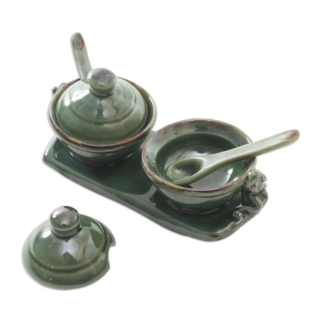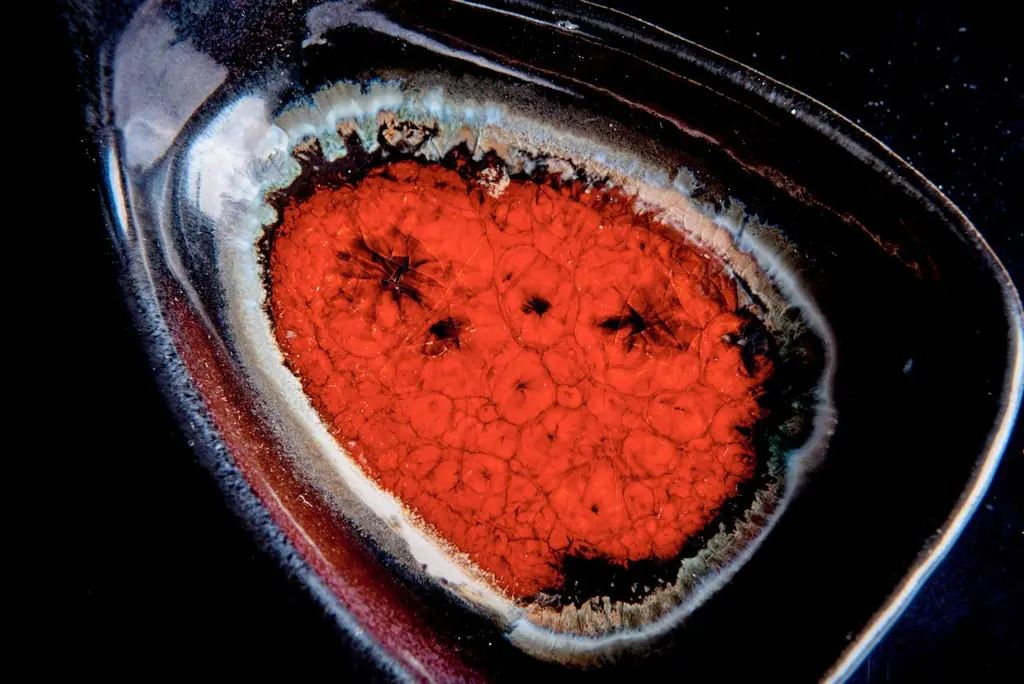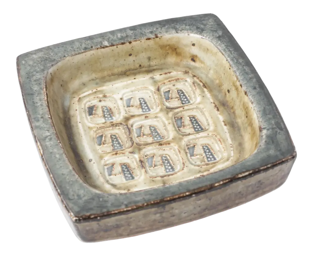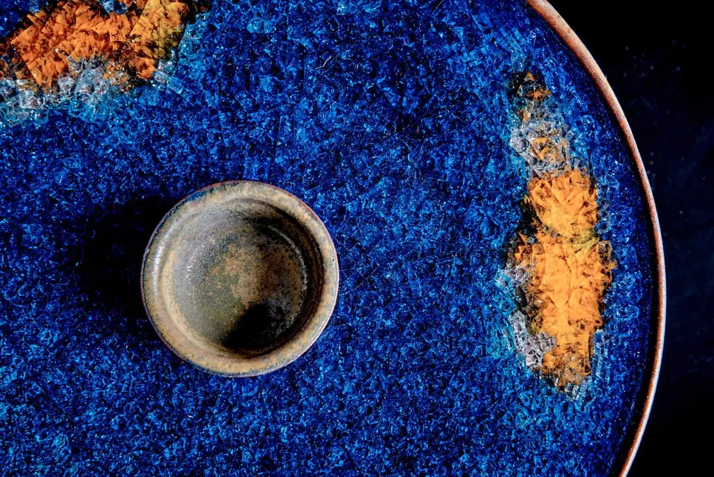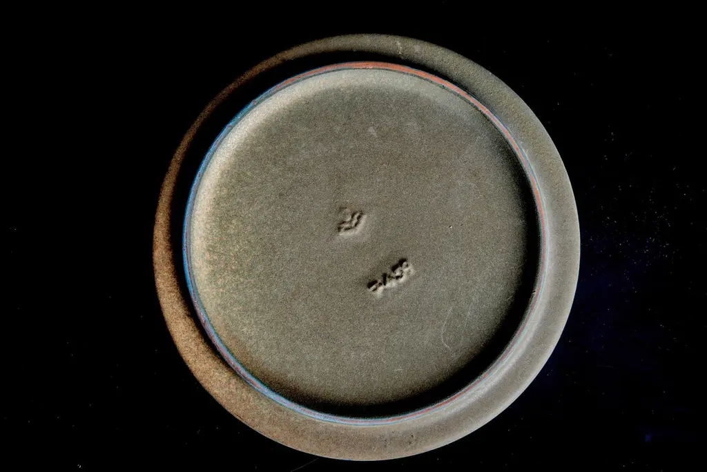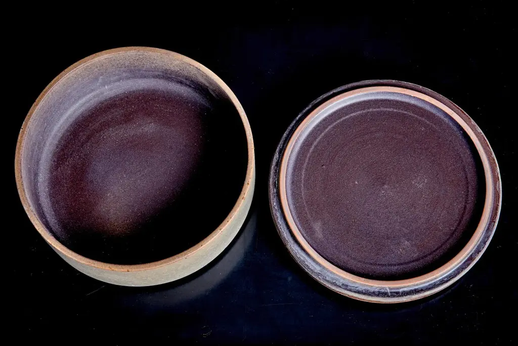 Nice pair of 1960s Majolika ceramics, known for bold glazes and artistic designs. The larger lidded container has a textured cobalt blue lid with gold and orange accents, contrasted by its earthy-toned base. The smaller spoon-like dish has a glossy black exterior with vivid red and orange glazing. These pieces highlight the era’s blend of functionality and artistic experimentation. The diamter of the bigger one is 22cm and it is 9cm high. The spoon shaped one is 15,5cm long 9,5cm wide and 6cm high.