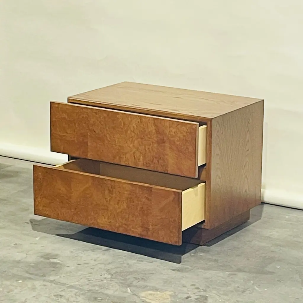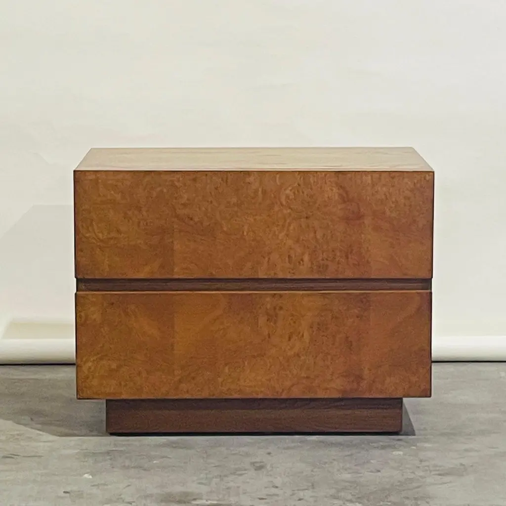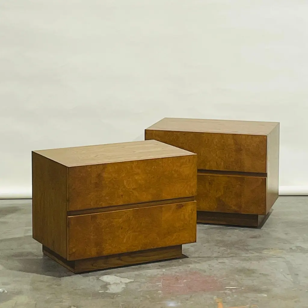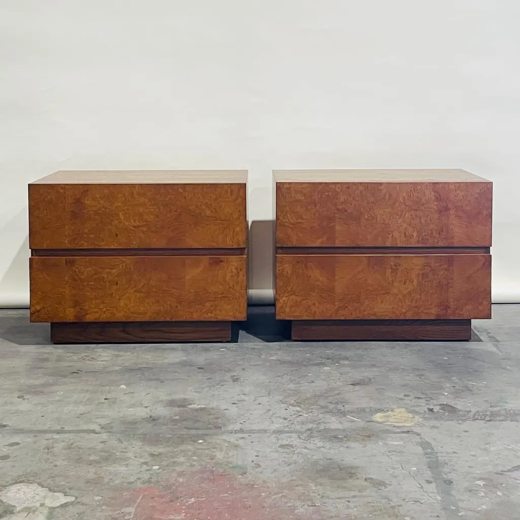 Pair of Minimalist 'Amboine' burlwood night stands by Design Frères.Simple, functional design with 2 deep drawers per night stand.