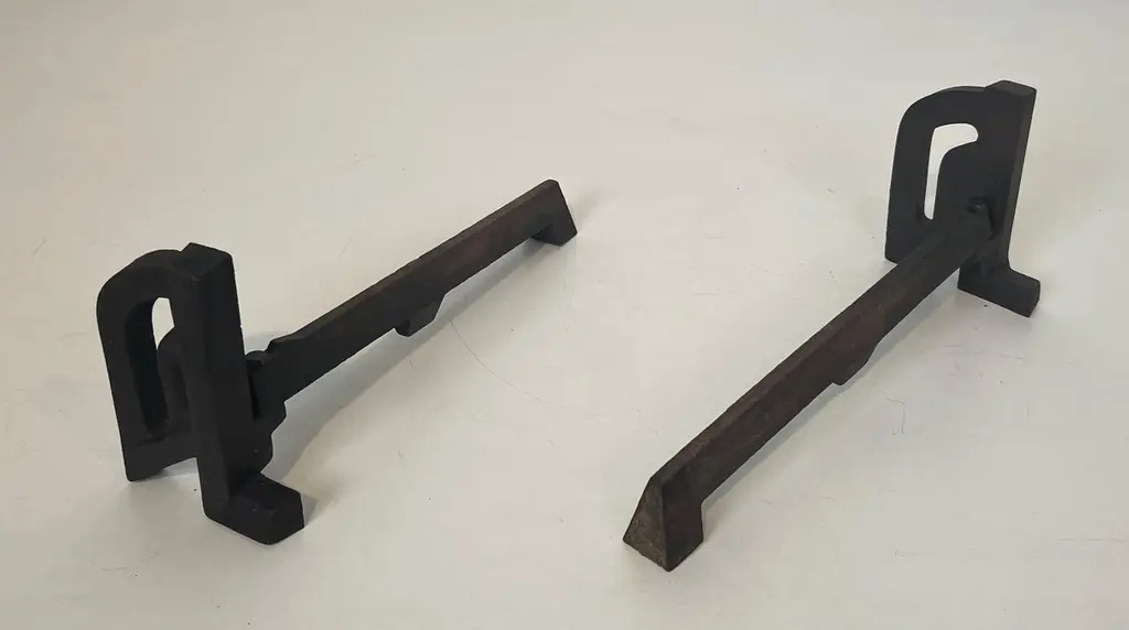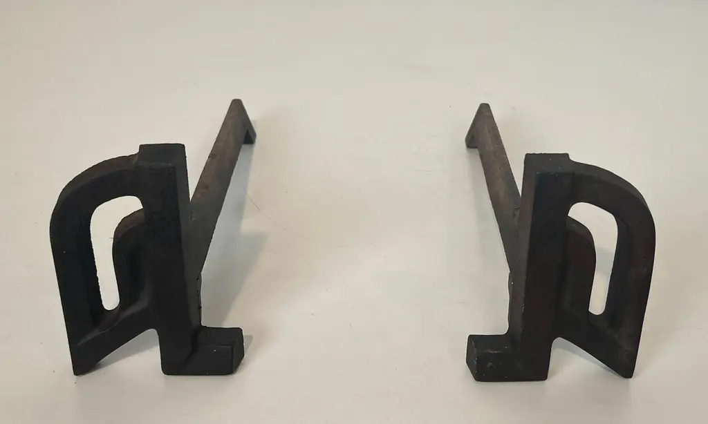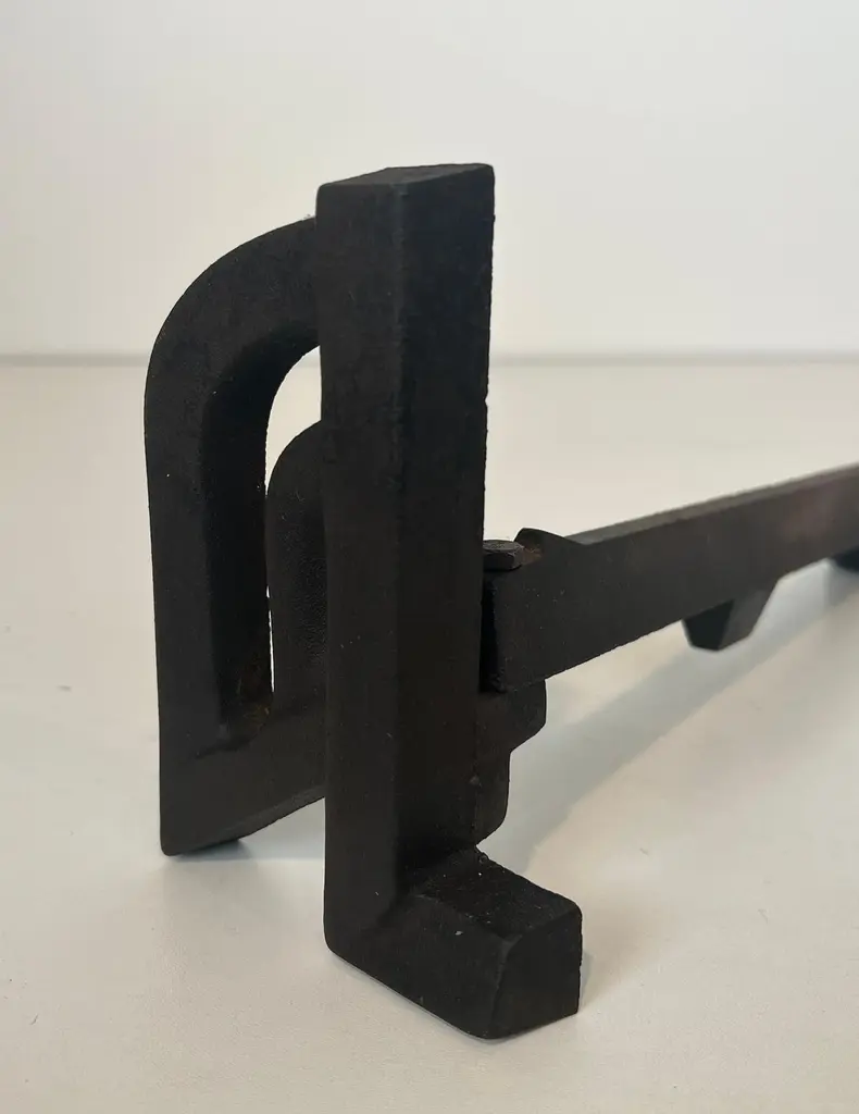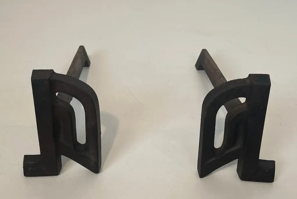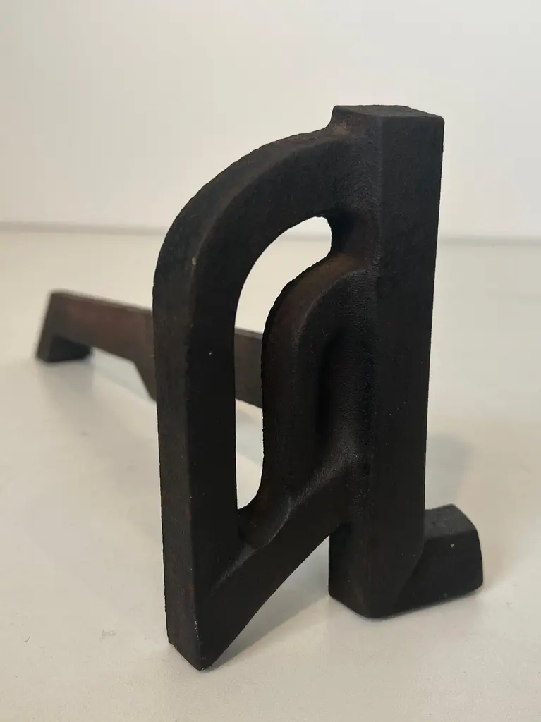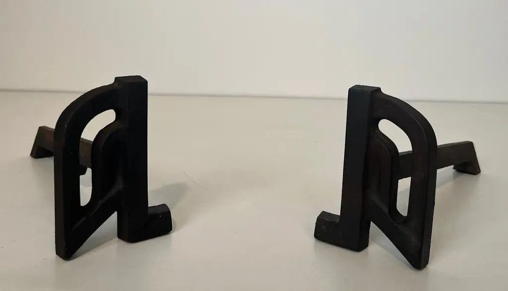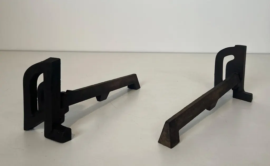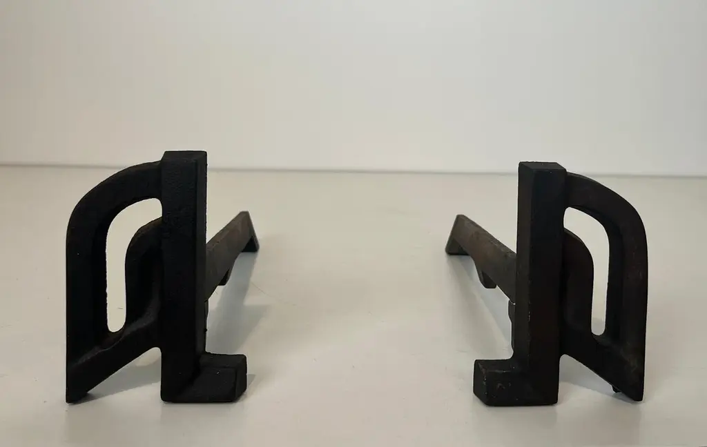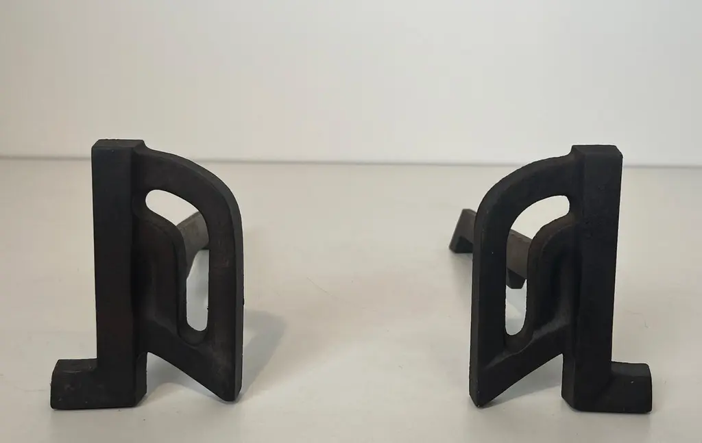 Pair Of Modernist Cast Iron And Wrought Iron Andirons. French Work. Circa 1940
