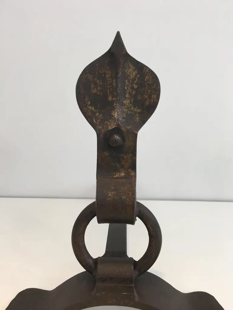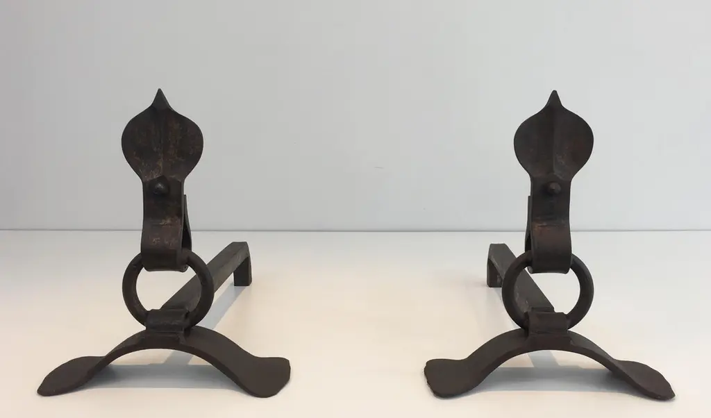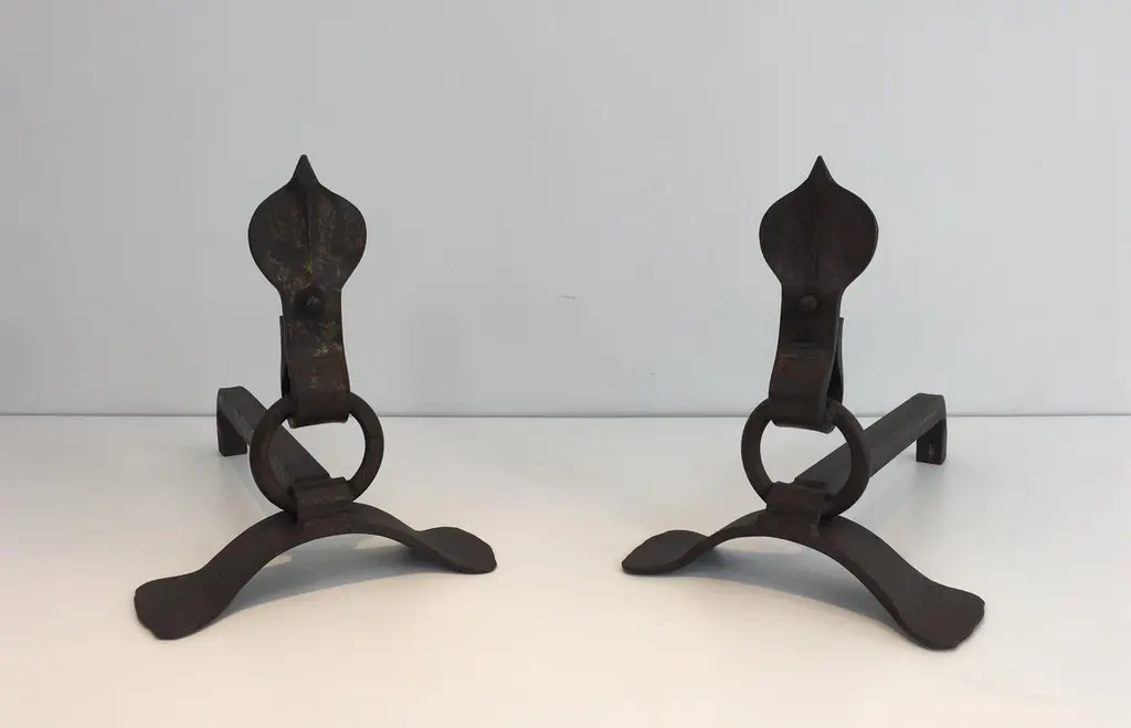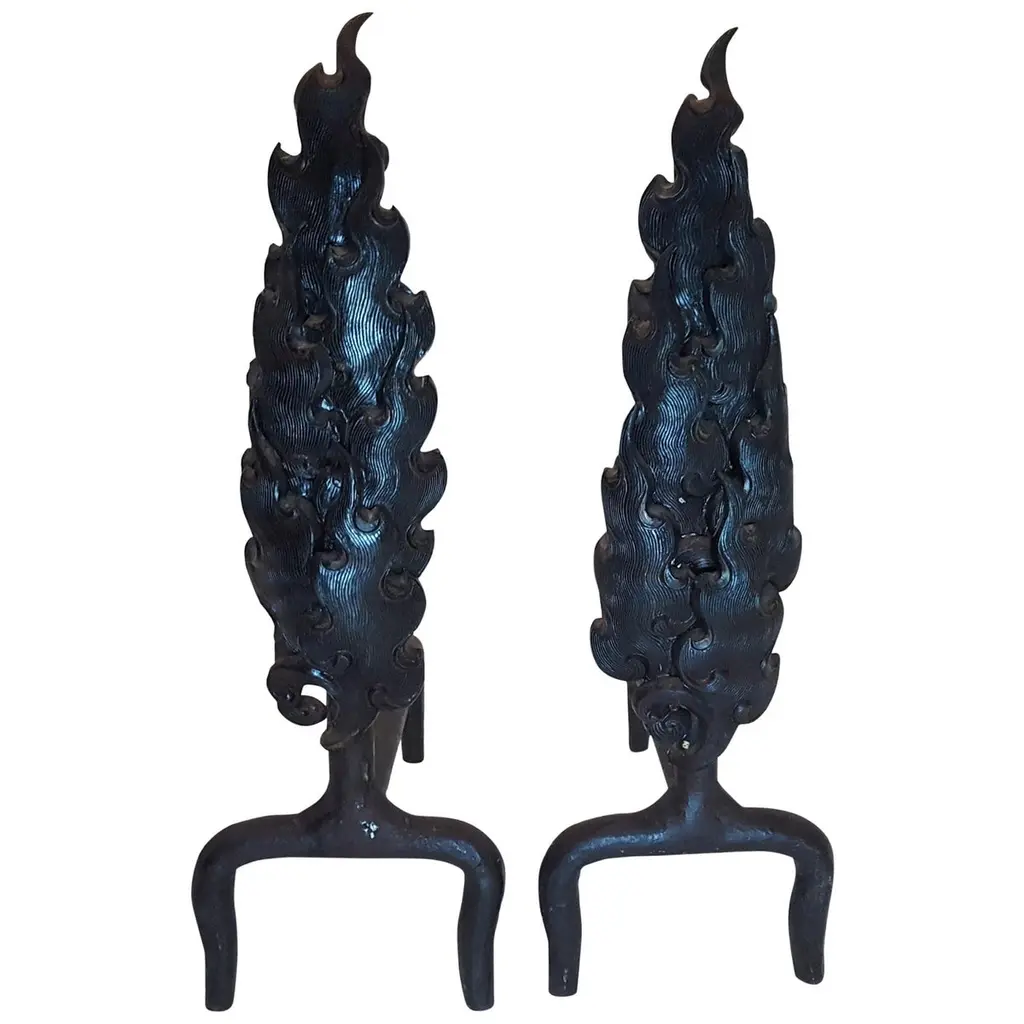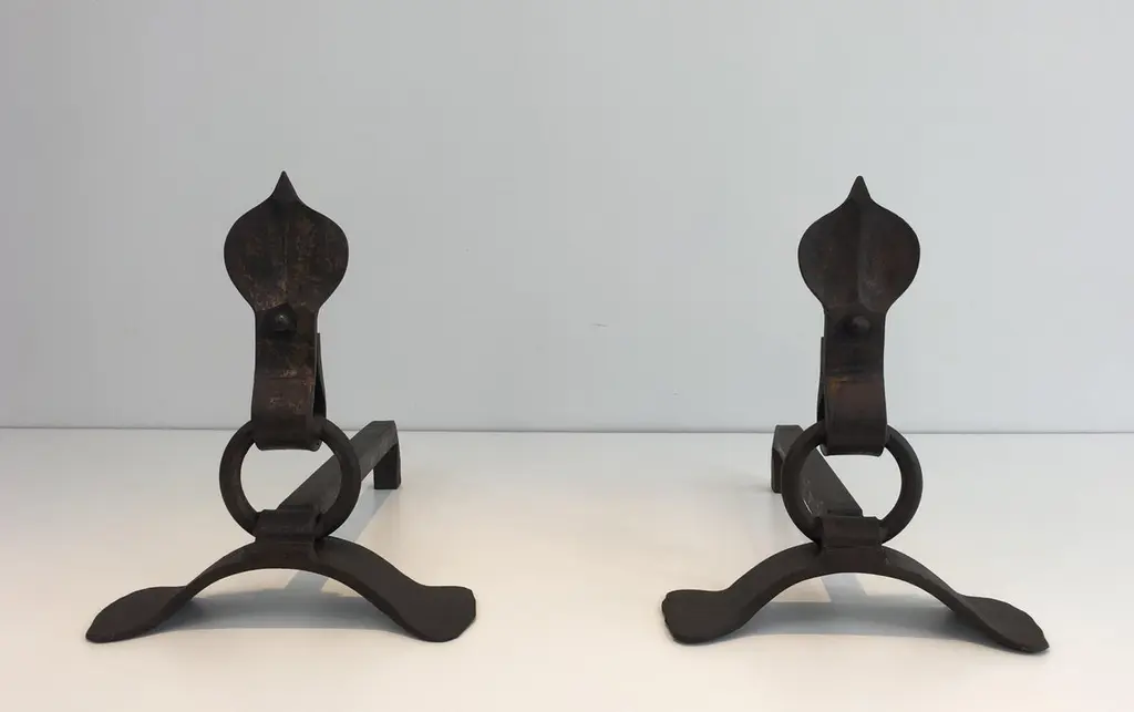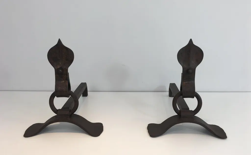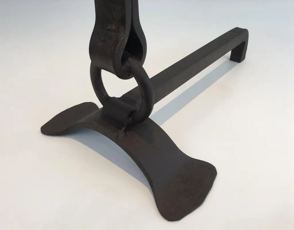 Pair of modernist wrought iron andirons, French, circa 1940.