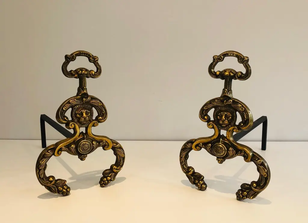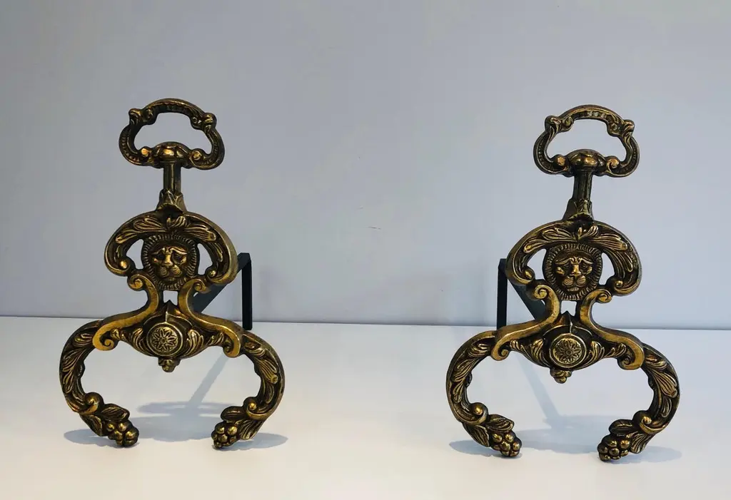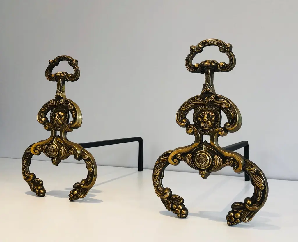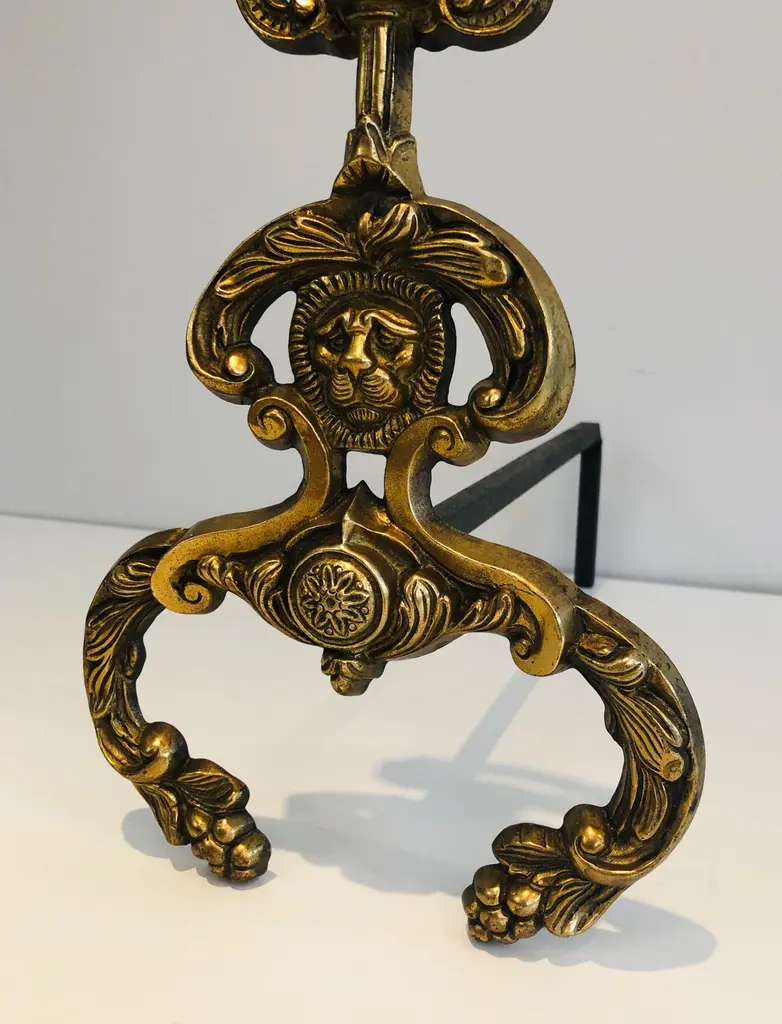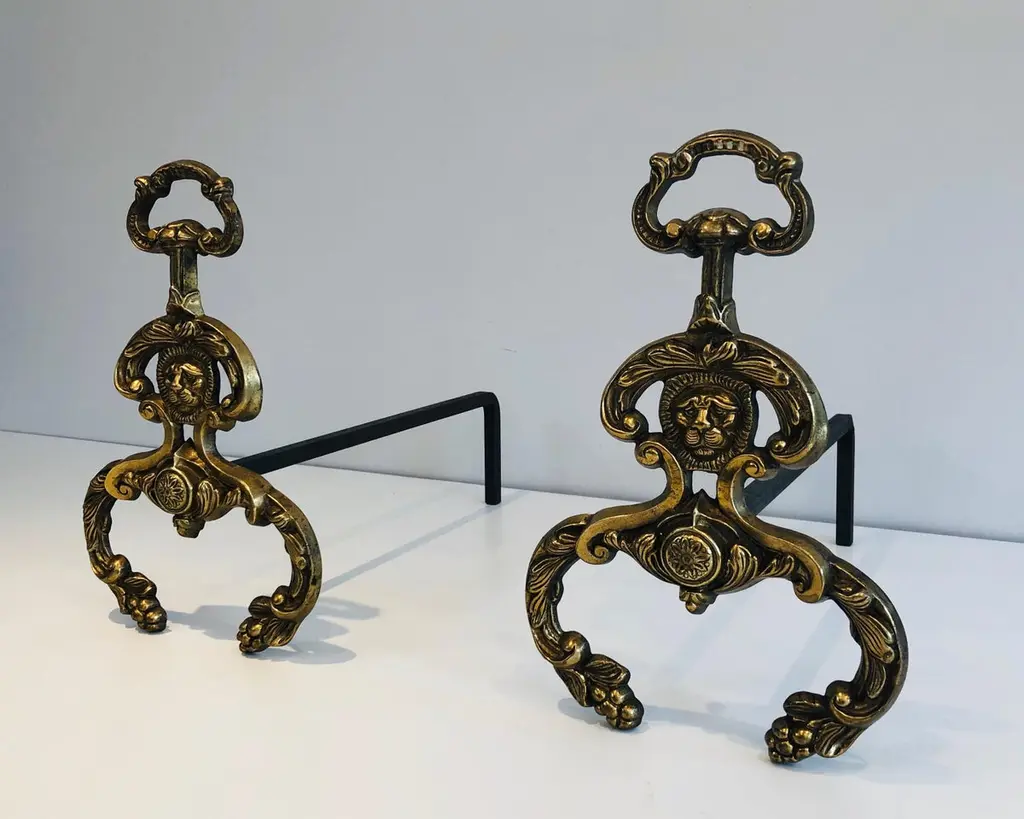 Pair Of Neoclassical Style Bronze And Wrought Ironandirons With Lions Faces. F