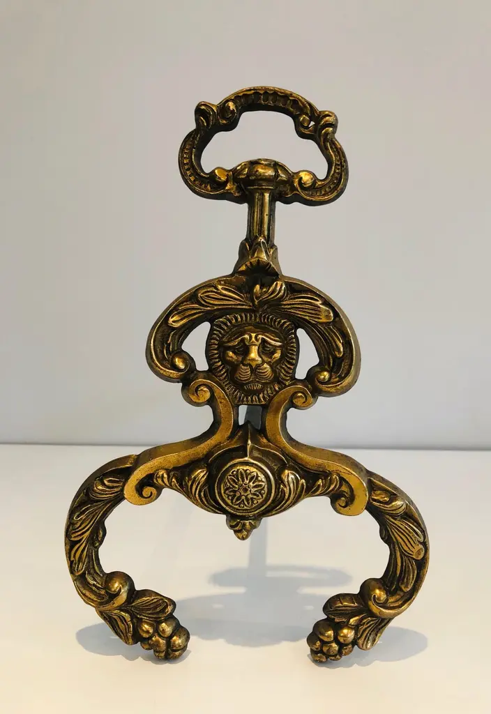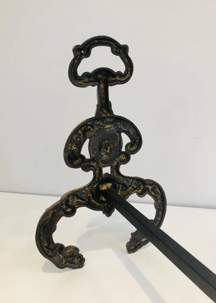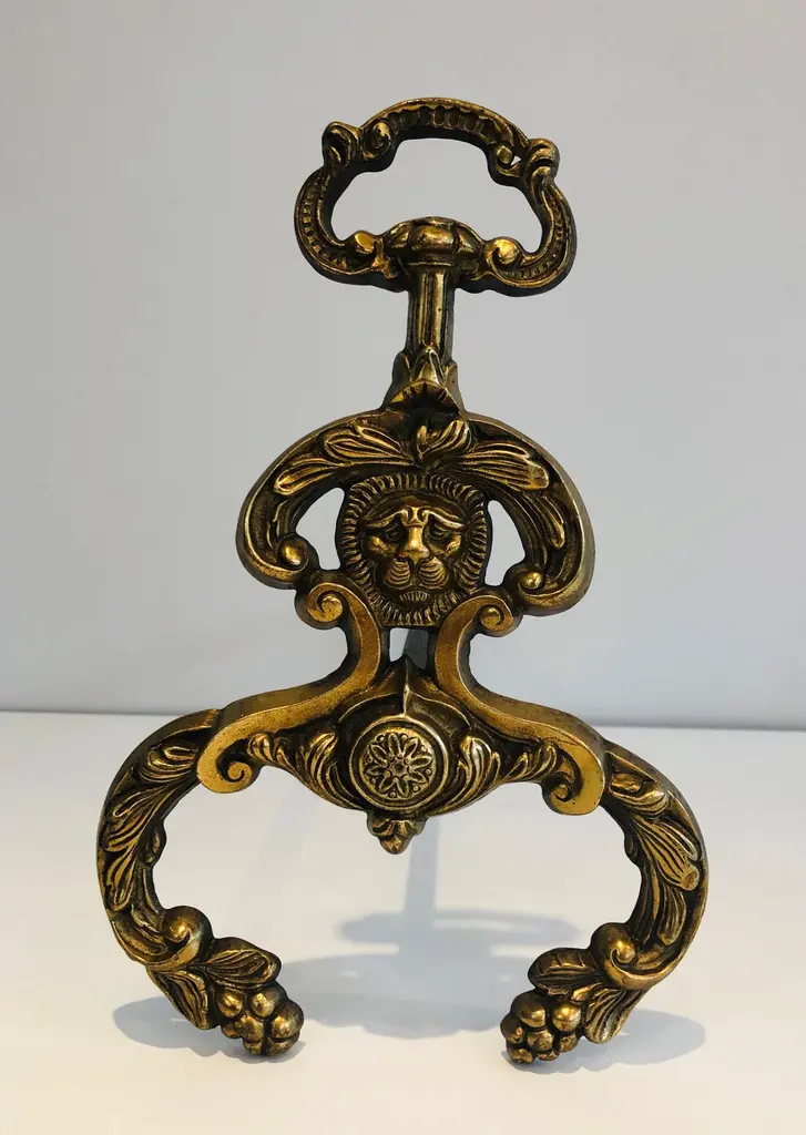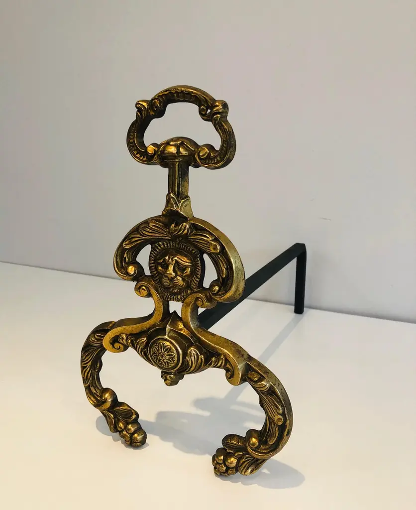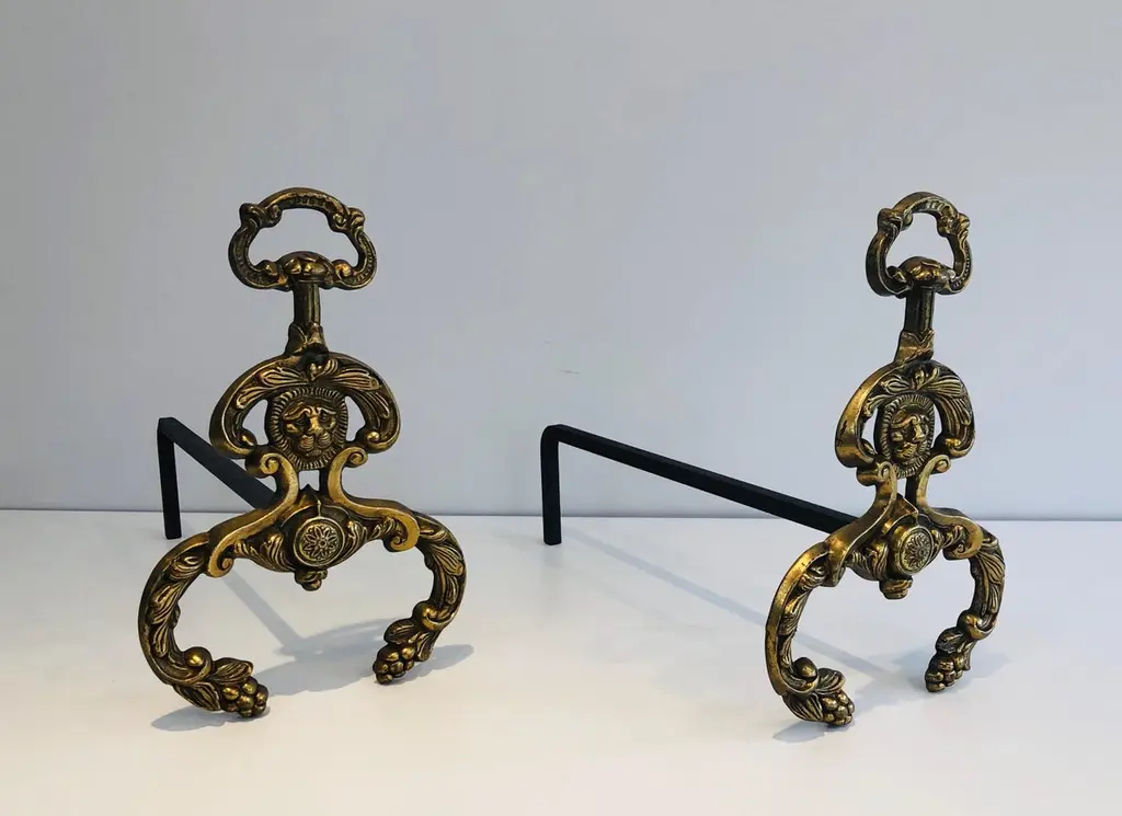 Pair Of Neoclassical Style Bronze And Wrought Ironandirons With Lions Faces. F