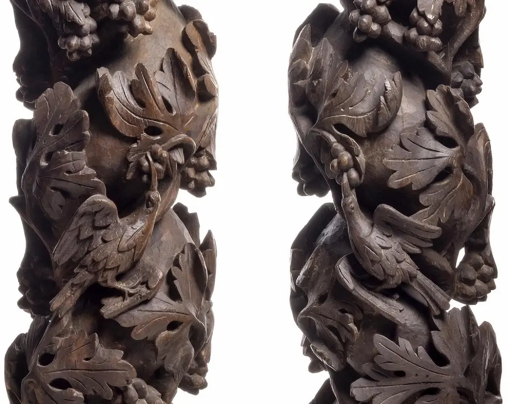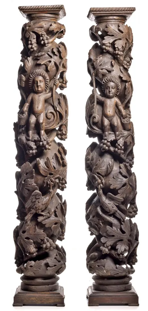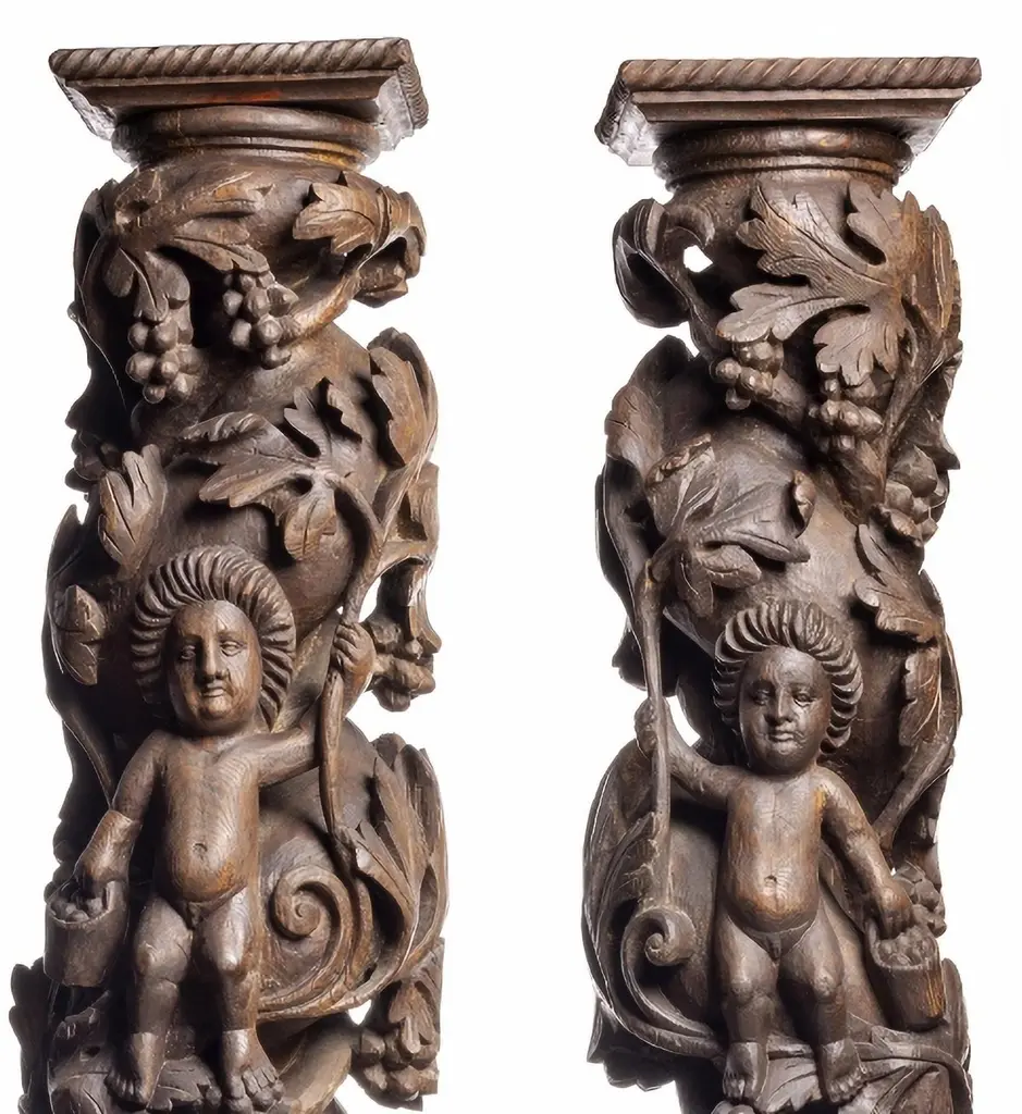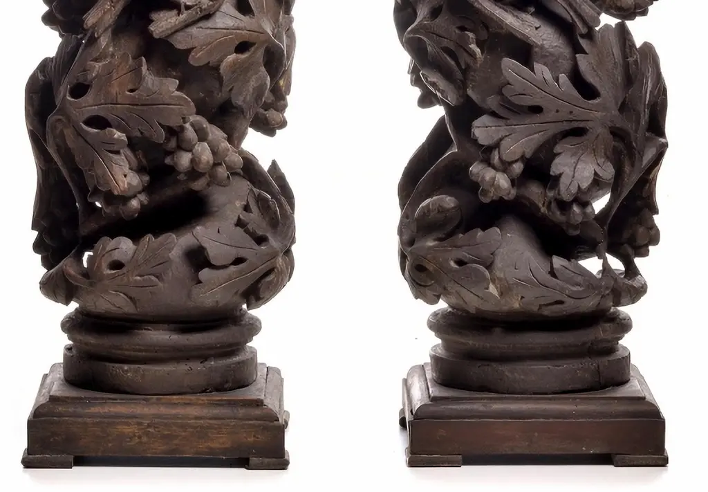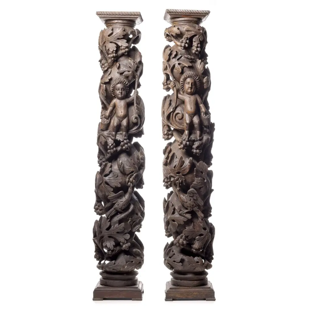PAIR OF PORTUGUESE COLUMNS 17th Centuryin chestnut wood with carvings, decorated with plant motifs, putties. Small flaws, traces of treated woodpeckers. Dim.: 141 x 22 cm.very good condition