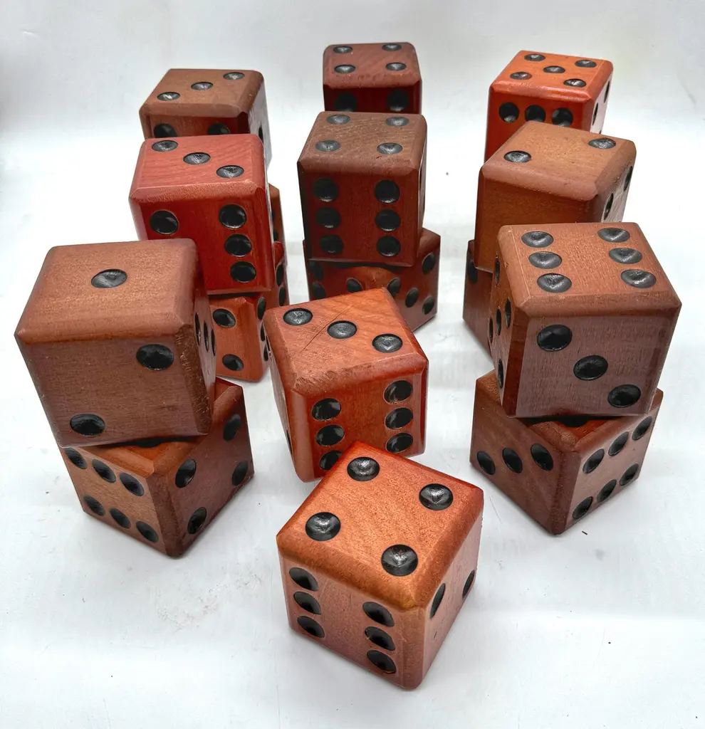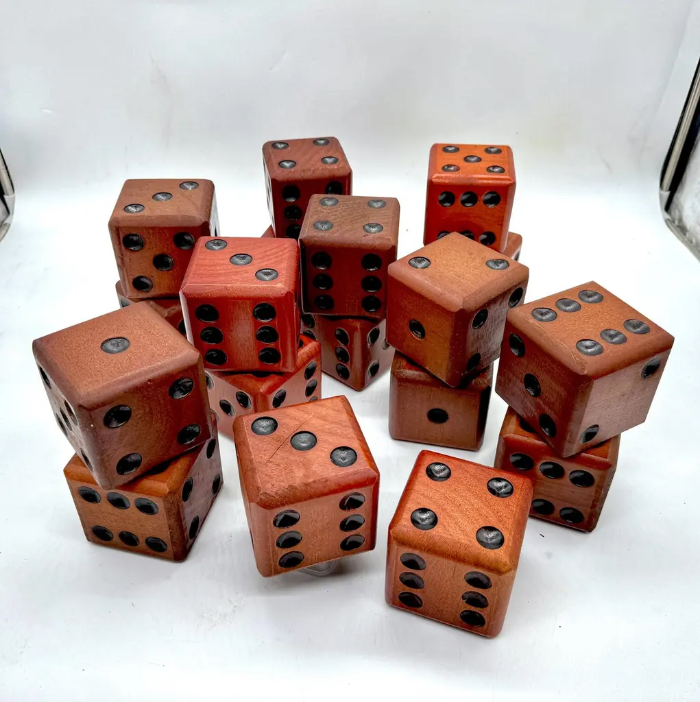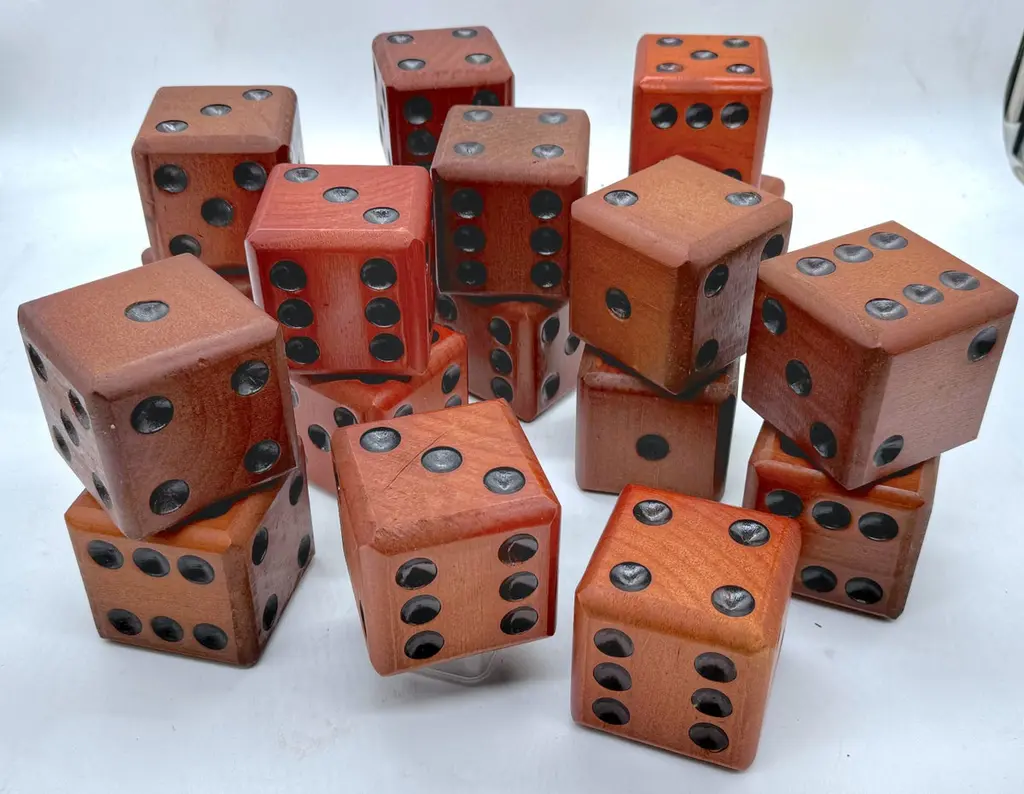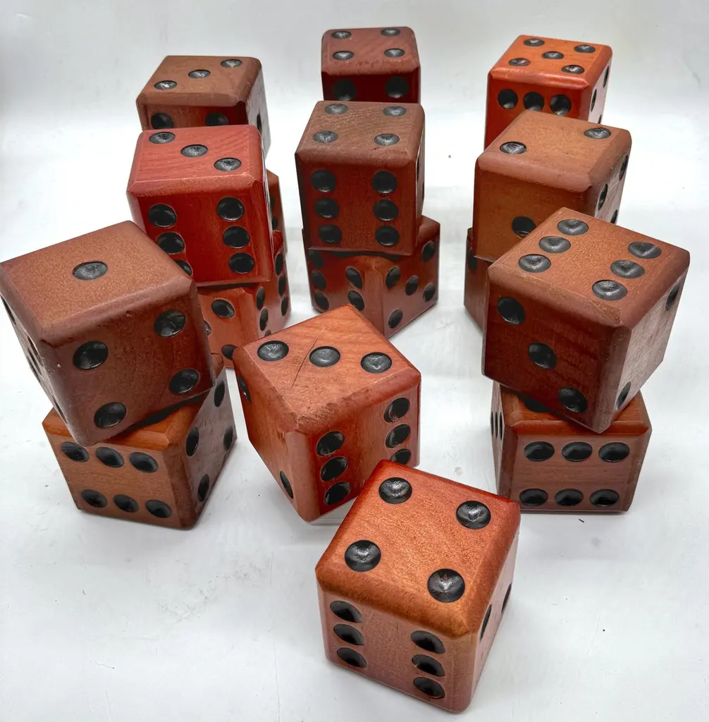 Pairs of Vintage Oversized Wood Carved and Ebonized Casino Dice, Sold in Pairs USA, circa 1960s We are pleased to offer up to nine pairs of vintage oversized wood-carved and ebonized casino dice, dating from the USA circa the 1960s. Each pair is a unique blend of craftsmanship with a vintage Vegas aura. These large dice, measuring 3.5 inches square, are well carved from wood and have incised, ebonized circles representing the numbers. The ebonized finish gives each dice a sophisticated, sleek look, and the color variations and minor wear and tear add a desirable patina that speaks to their age and history.These oversized dice are not only visually striking but also versatile, ready to be placed as decorative accents or used. Their substantial size and distinctive appearance make them ideal for unique collections or interiors. Whether you’re a collector of vintage items or looking for unique vintage objects, These wood-carved and ebonized casino dice offer a perfect blend of history, artistry, and functionality. They are rare items, sold in pairs, and bring a piece of mid-century Vegas-style Americana into your collection or interior.