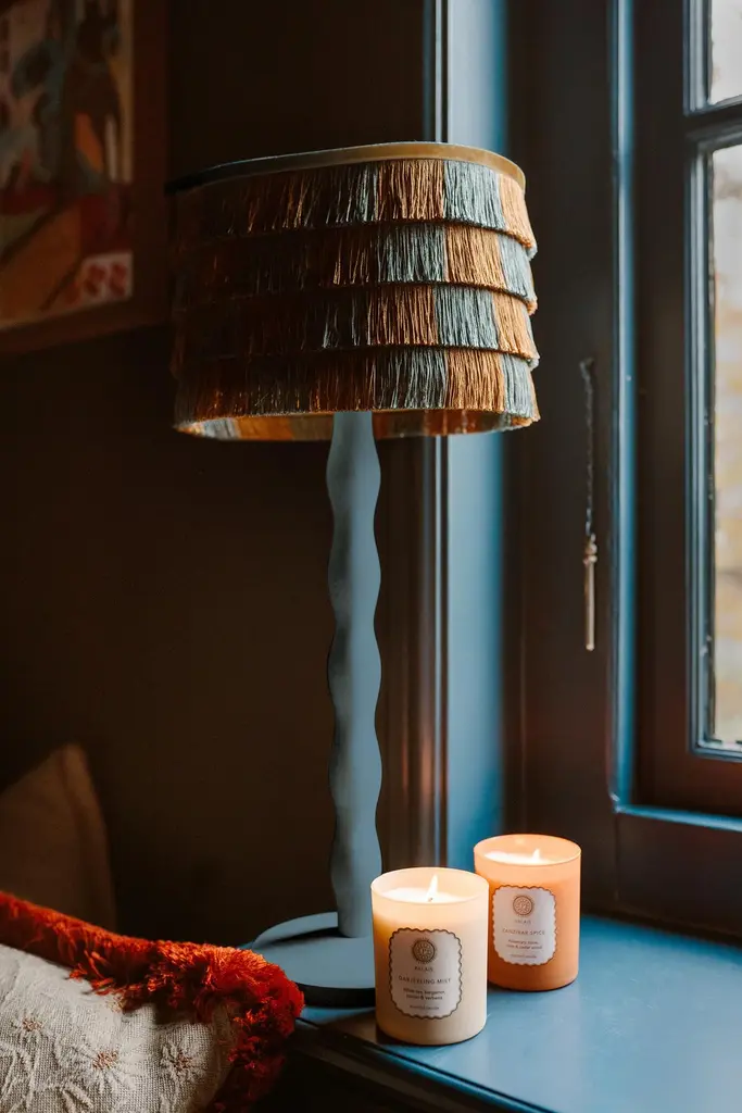 Unveil a touch of retro elegance with the Giselle lampshade, featuring a playful block-fringe pattern that nods to the glamorous 1970s. Luxurious frills sway gracefully, adding festive charm and movement to any space — from bedside tables to hallways or as an unexpected statement in your living room. Crafted from soft, durable cotton with an opulent matte-gold interior, Giselle radiates warmth, sophistication, and a subtle shimmer. Finished with a sumptuous velvet trim, this design brings a chic, whimsical twist to your décor. Designed for a US spider frame / harp fitter, compatible with most standard lamp bases. Hand-assembled in a Dutch atelier with attention to detail and minimal waste, the Giselle lampshade blends vintage-inspired style with mindful craftsmanship.