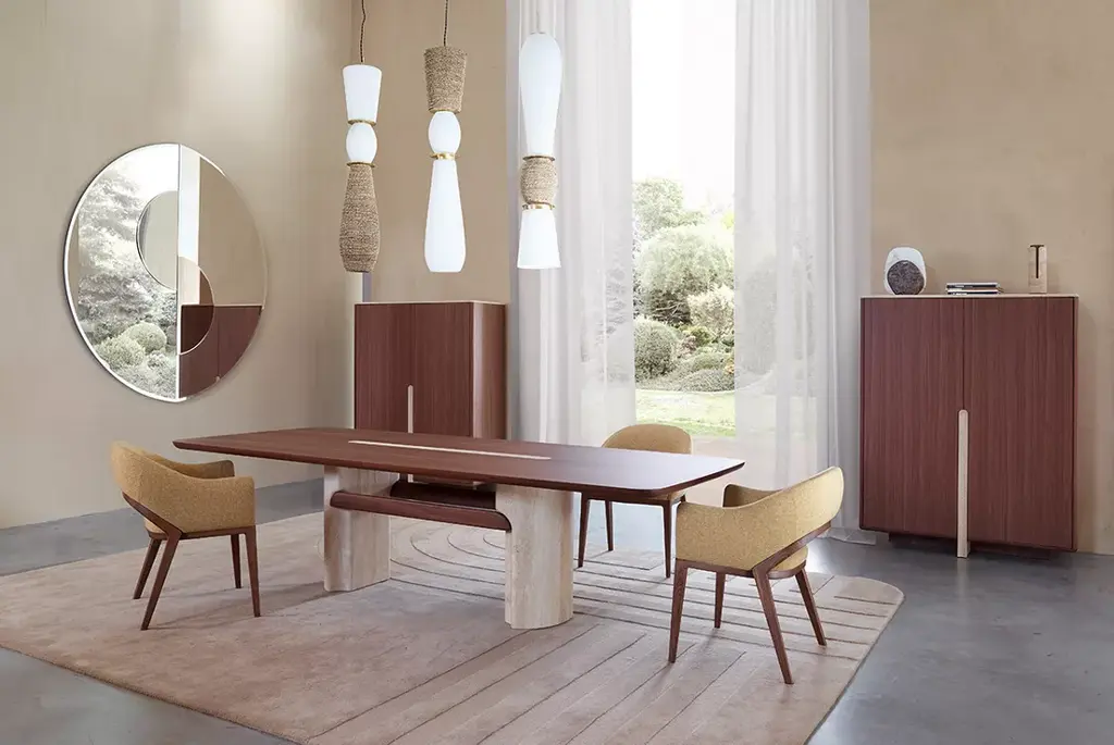 Composed of a table, a sideboard, and a seating arrangement, Palatine is the designer's tribute to Italy, which inspires him: to its history and way of life, to its classical or contemporary architecture, and to all the details that make light cling to a column, a hollow, a projection, as on the facade of a building.