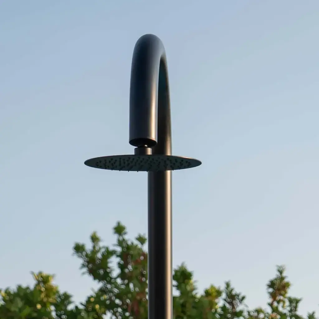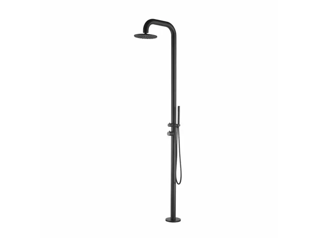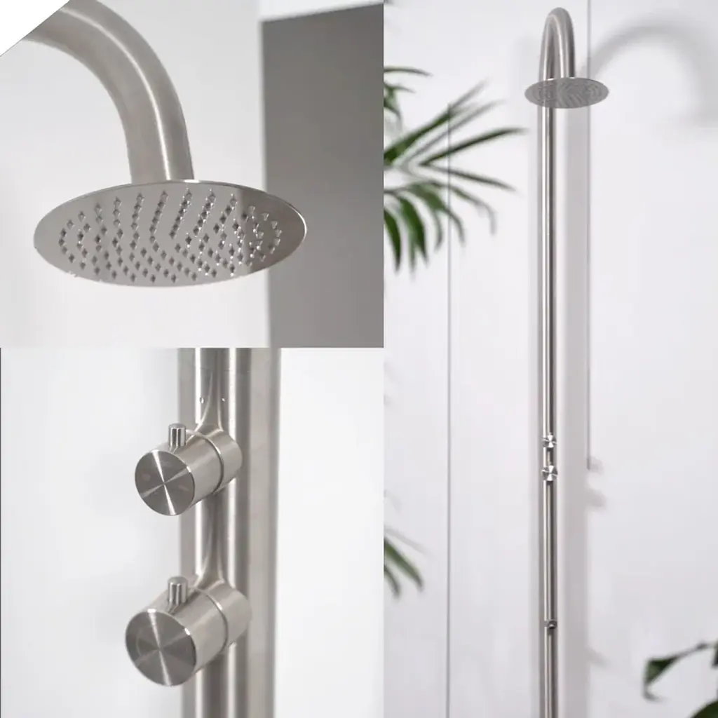 The shower with foot wash model PALAU is a shower in Satin Stainless Steel Aisi Inox 316L with hot and cold water inlet. The outdoor shower is excellent for commercial, private use, for outdoor-interior swimming pool, garden or for the bathroom at home. Height 2439 mm. diameter 60 mm.Features:– Double mixer, it allows to have hot water from the shower head and from the footwash.– Concealed water connections on the base.– Taps in Aisi 316L Steel.– Water connection from the bottom with quick couplings.The steel used is high quality Aisi Inox 316L, also known as marine steel, which is better than AISI 316. It differs from AISI 316 stainless steel due to the lower amount of carbon present, L stands for “low carbon”. This makes the steels in this series particularly resistant to corrosion (especially pitting) even in particularly reducing, highly saline environments, guaranteeing excellent resistance to corrosion.Unlike solar-heated outdoor showers, you don`t have to worry about placing this shower in direct sunlight. The only limitation is your choice.Italian StyleSined presents the new line of garden and swimming pool showers and the new line of outdoor furniture. High quality, care for design, attention to the smallest detail and uniqueness, which characterize all the Italian excellences so appreciated in the world.Although industrially manufactured, everything is created by an Italian studio and under strict supply chain directives such as the control of the various samples tested in Italy, up to the complete product and its certification.The internal design was followed by a staff of Italian specialists, who analysed every single component, considering possible problems and studying solutions to prevent them. Everything to define high-end products!Everything is made from the highest quality materials. Every single component has been selected with extreme care. The products are marketed with a series of useful, not to say indispensable, accessories that are normally paid for separately.The physical production was then entrusted to an Asian factory with a great deal of know-how, and internationally recognised for its extremely precise quality control. The production facilities and state-of-the-art machinery used are so expensive that only such large economies of scale can sustain them.PositioningIt is recommended to install the shower on a solid, perfectly flat and level support, capable of supporting the weight of the shower and preventing it from falling, such as a concrete floor, stone, concrete base, etc. The shower is fixed by means of the plugs supplied and the C-BOX supplied. It is recommended to install the shower on a solid, perfectly flat and level support, capable of supporting the weight of the shower and preventing it from falling, such as a concrete floor, stone, concrete base, etc.