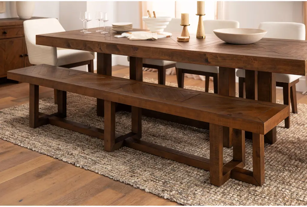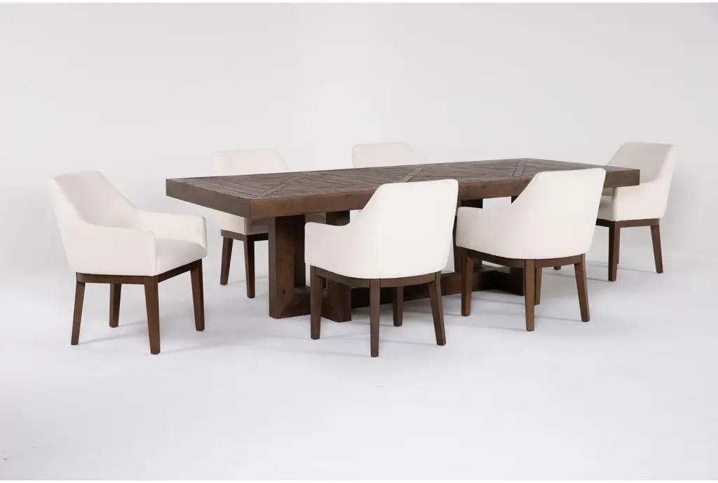 Palazzo Brown Natural Rectangular Solid Pine Wood 106" Dining Table With Armchair Set For 6 | Trestle