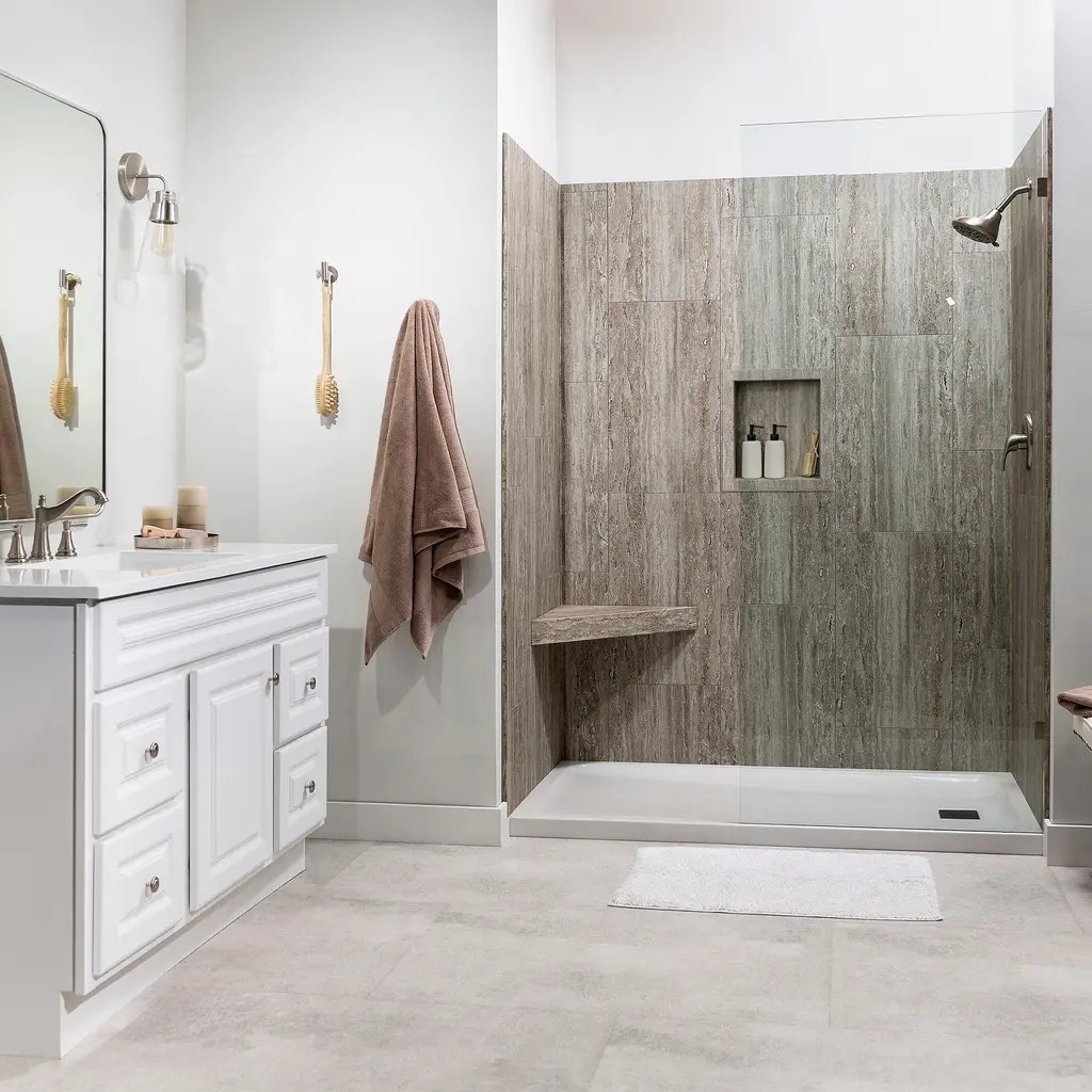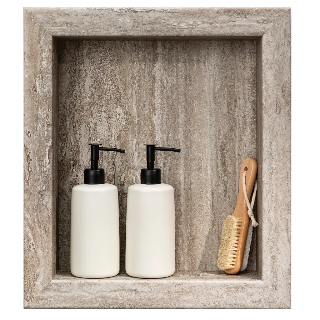 The Palisade shower niche perfectly match all Palisade finishes to add functionality and style to any Palisade shower installation. This waterproof accessory is made of durable PVC with a lacquer finish for lasting strength and easy maintenance. The shower niche slides into a pre-cut hole in shower wall and can be installed vertically or horizontally over Palisade tiles. • Prefabricated vinyl shower niche is fully sealed for hassle-free, quick and easy installation • 100% waterproof and leak-proof storage for shower necesseties • Can be installed horizontally or vertically with adhesive for PVC panels and a silicone-based sealant • Shower niche has overall dimensions of 17.5 in. x 15.5 in. x 3.75 in. with inner storage dimensions of 14 in. x 12 in. x 3.5 in. • Available in the same finishes as the Palisade Tiles and Palisade Tile Shower Kits