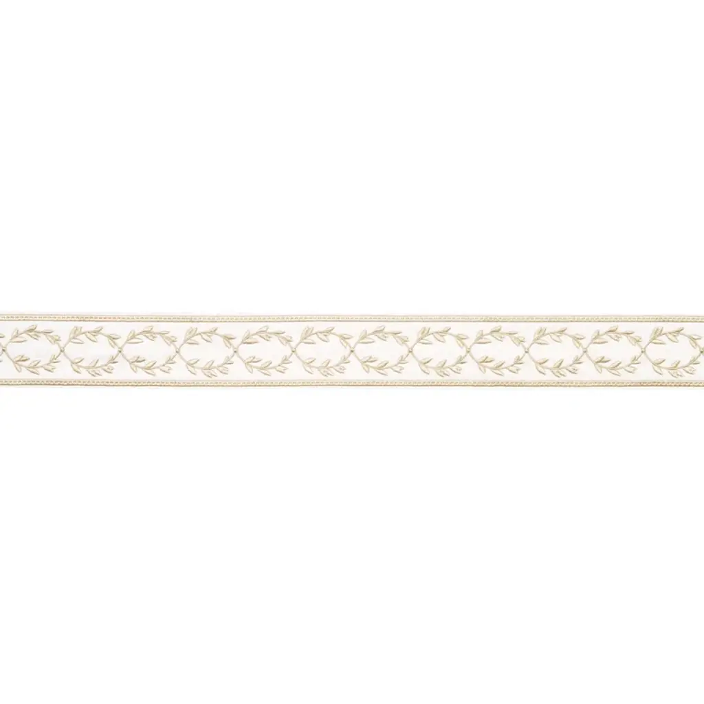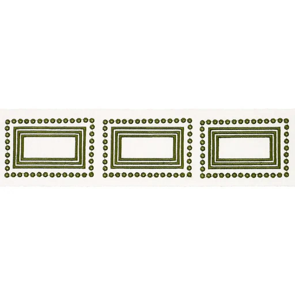 Created in collaboration with Paloma Contreras, Porte Parisien is a chic and lively pattern inspired by a rivet detail spotted on a door in Paris. Featuring concentric rectangles and rhythmic dots embroidered on 3-inch-wide cotton faille tape, this fabulous trim adds polish and finesse to upholstery, window treatments, and pillows.