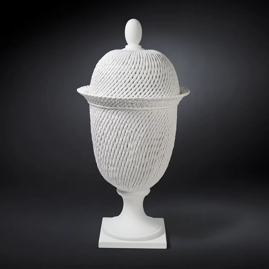 Inspired by Italian history, culture, and Renaissance art, this splendid potiche is named after renowned architect Andrea Palladio. Boasting a majestic silhouette furnished with lid, it is exquisitely handcrafted of white ceramic and adorned with a dashed-like motif covering its entire surface and adding unique textural value to the piece.