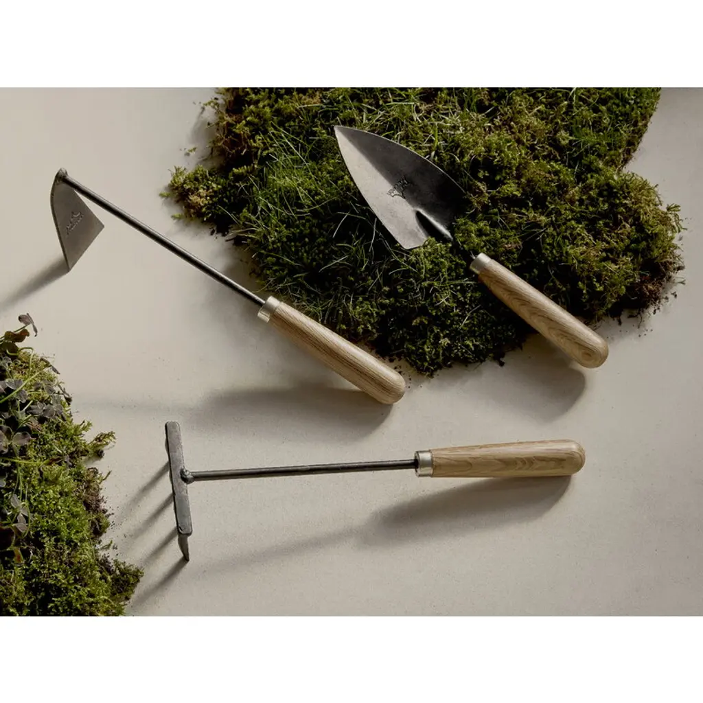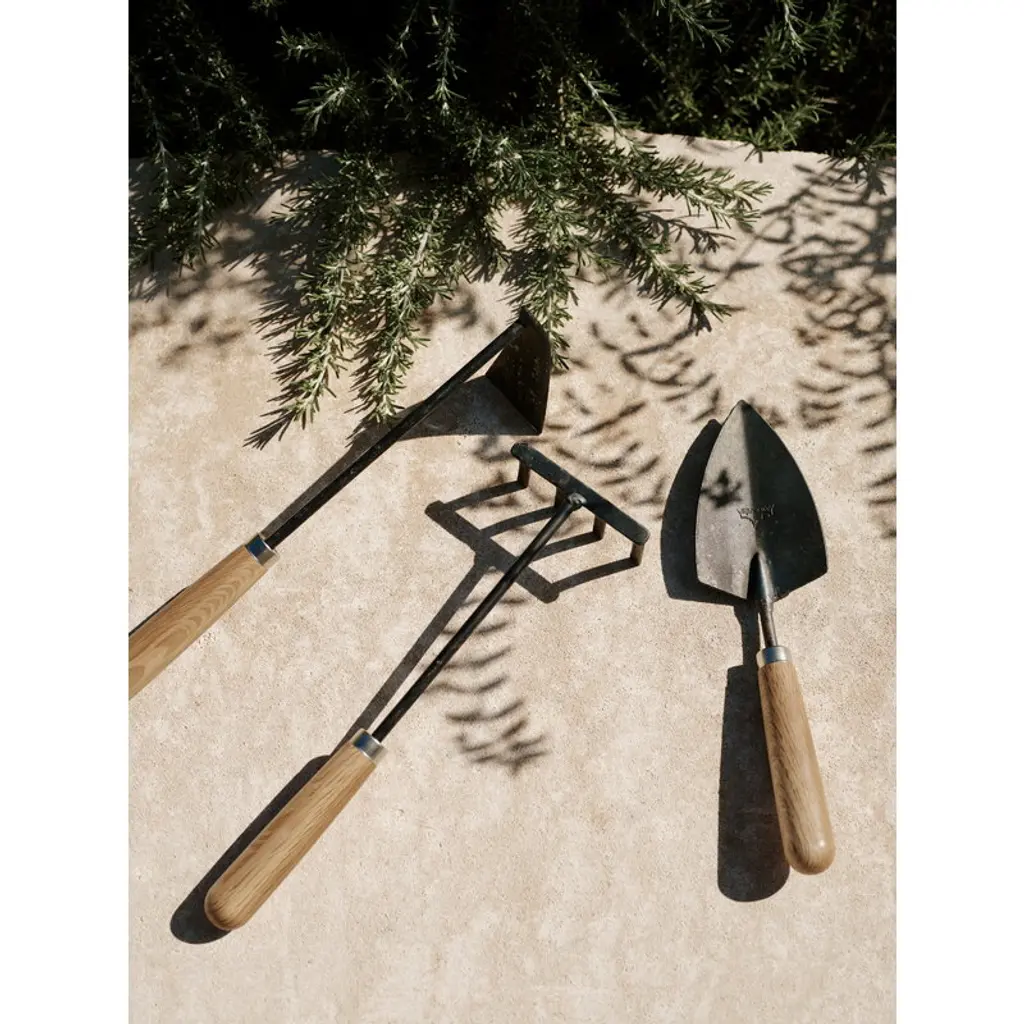 Pallarès x Audo Copenhagen plant tools set includes the fitting tool for every gardening task. Whether you're just a newcomer to gardening or a more experienced green thumb, this set is sure to provide what you need! The three-piece collection consists of a hoe, a hand rake and a trowel that make digging, weeding and planting quick and easy. The garden tools are made of high-quality carbon steel, that is resistant to time and use, and their elegant look is finished with an oak handle and leather details. The plant tools set is part of a garden collection, designed in collaboration between Audo Copenhagen and Pallarès. The Spanish Pallarès is best known for its high-quality knives and tools, which the company has made for over 100 years.