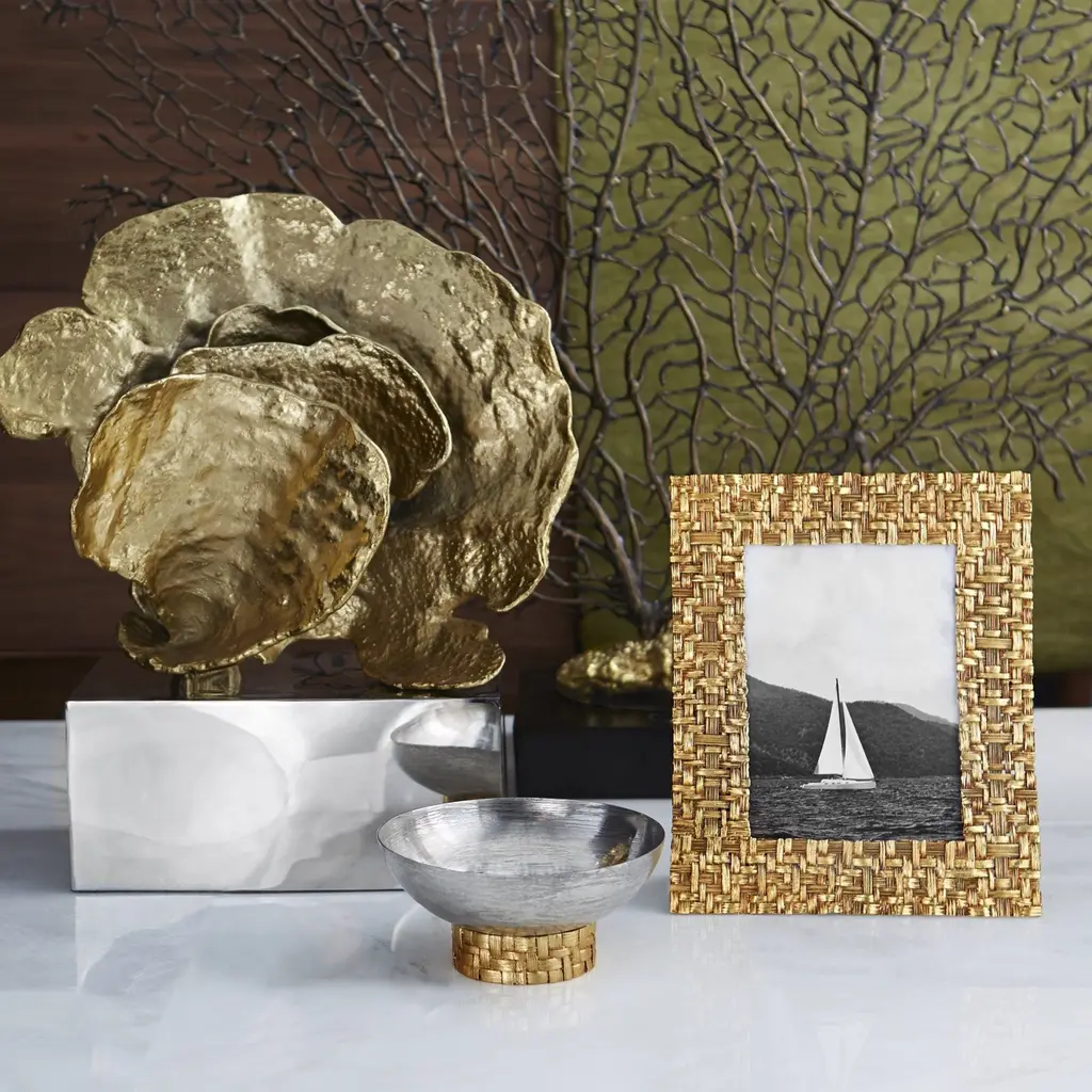 The rustic texture of wind-swept palm fronds was the muse behind Michael Aram's sculptural Palm collection. Each piece's intricate, handcrafted silhouette is artfully highlighted by a warm antique-gold finish.