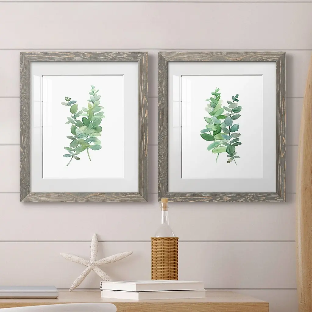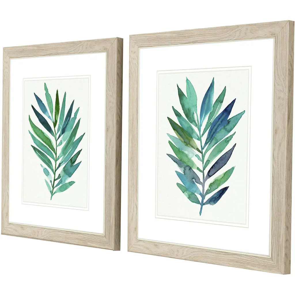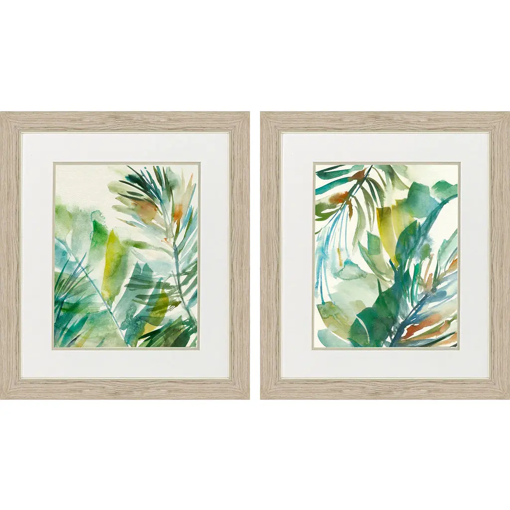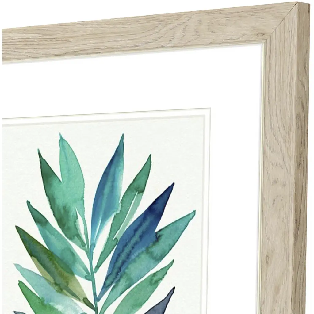 A set of two palm images that are accentuated with double matting. These pieces are framed under glass and paired with a white wash frame.