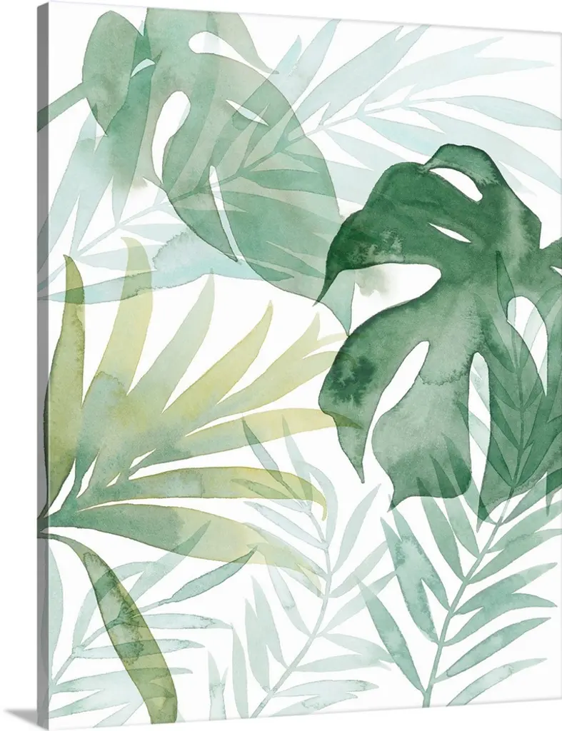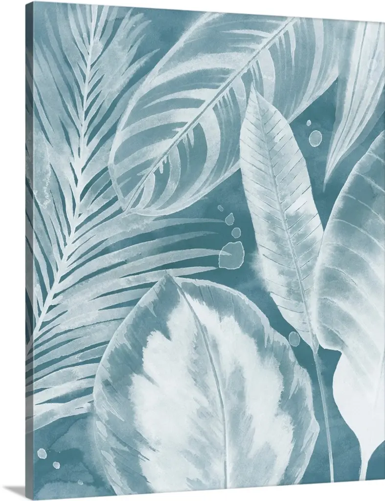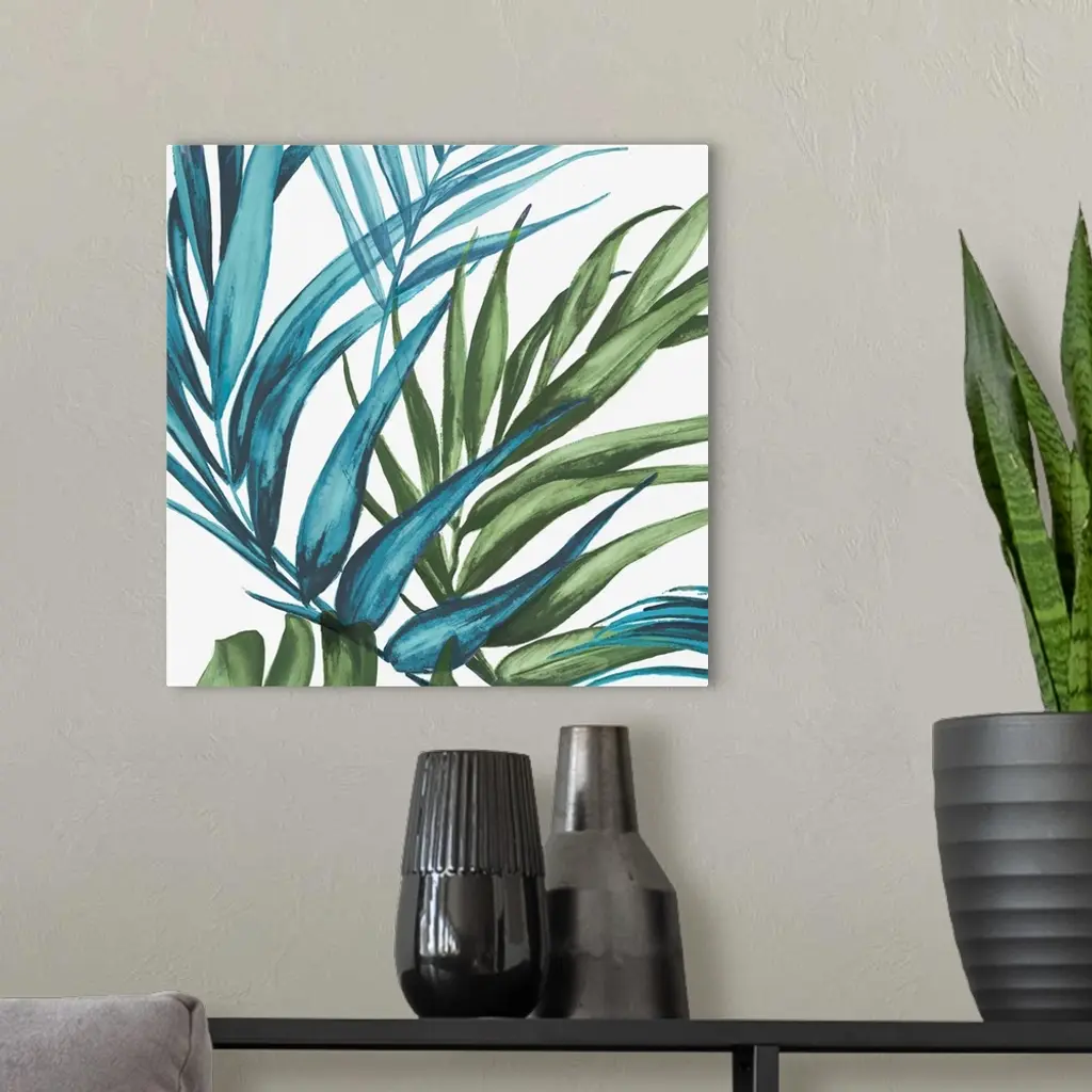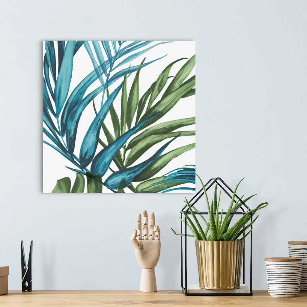 Square decor with illustrated tropical palm leaves in blue and green hues on a white background.