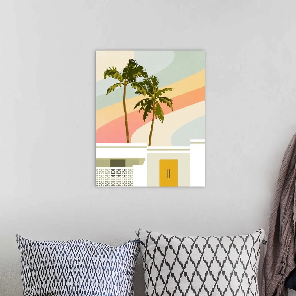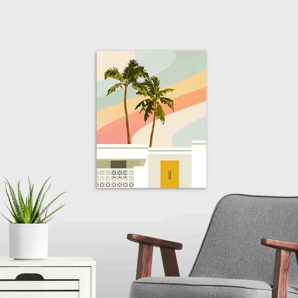 A contemporary mid-century modern graphic illustration of a white stucco home with classic palm springs architectural details and two tall palm trees in front of a swirly pastel sky