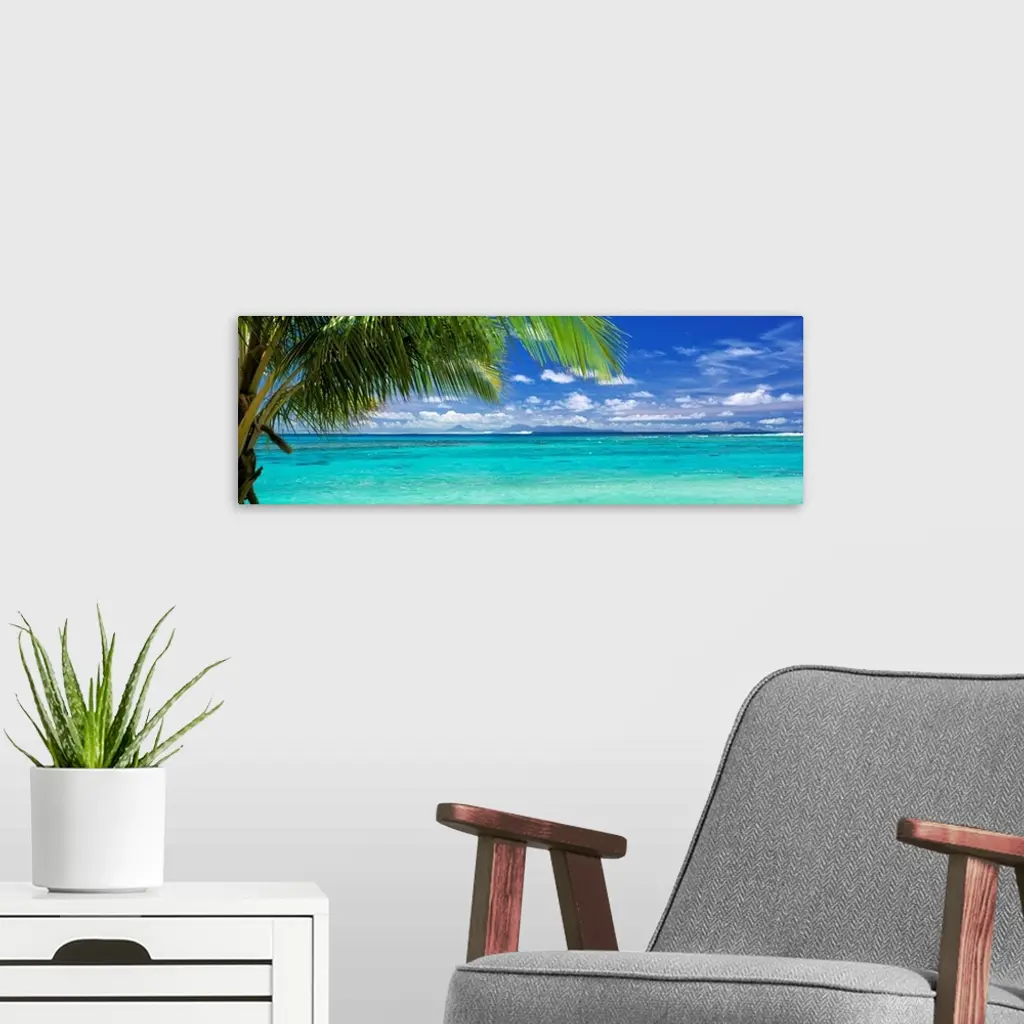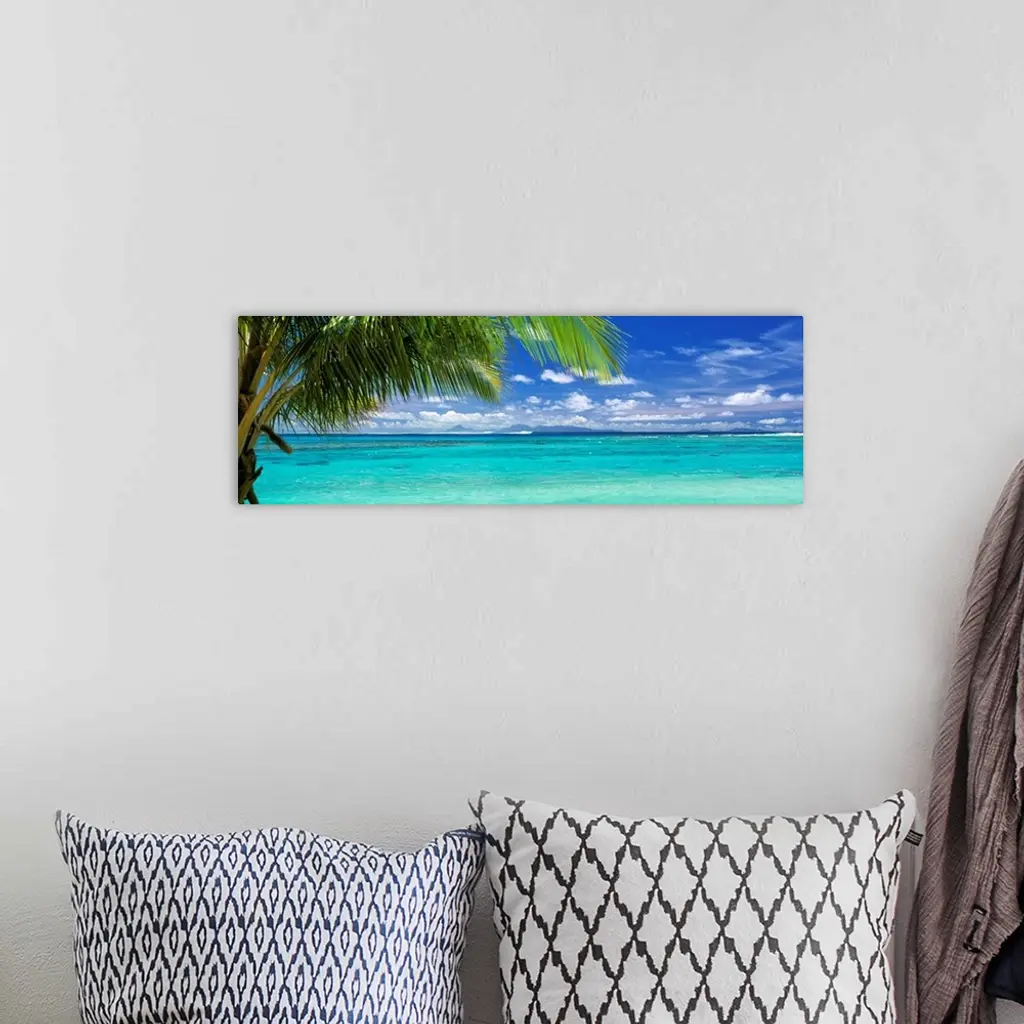 Panoramic photograph of a large palm tree waving over crystal clear ocean water under a bright blue sky.