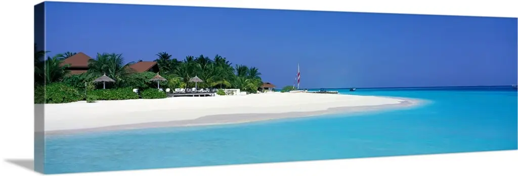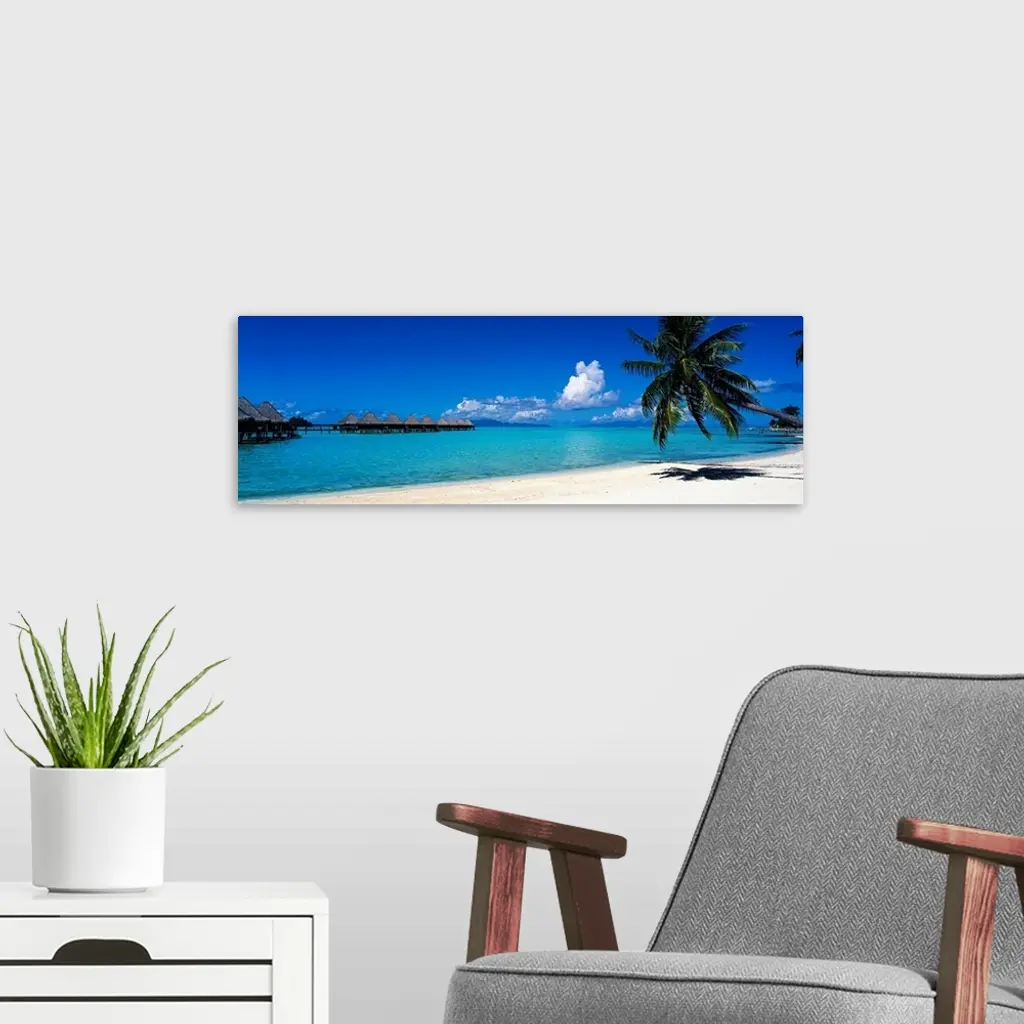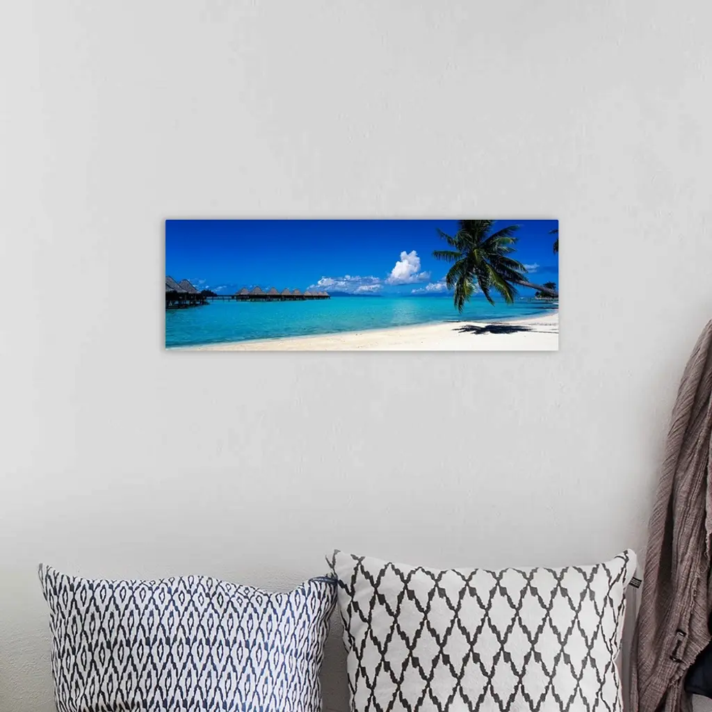 A panoramic photograph of a tropical beach with palm trees and thatch huts over the water.