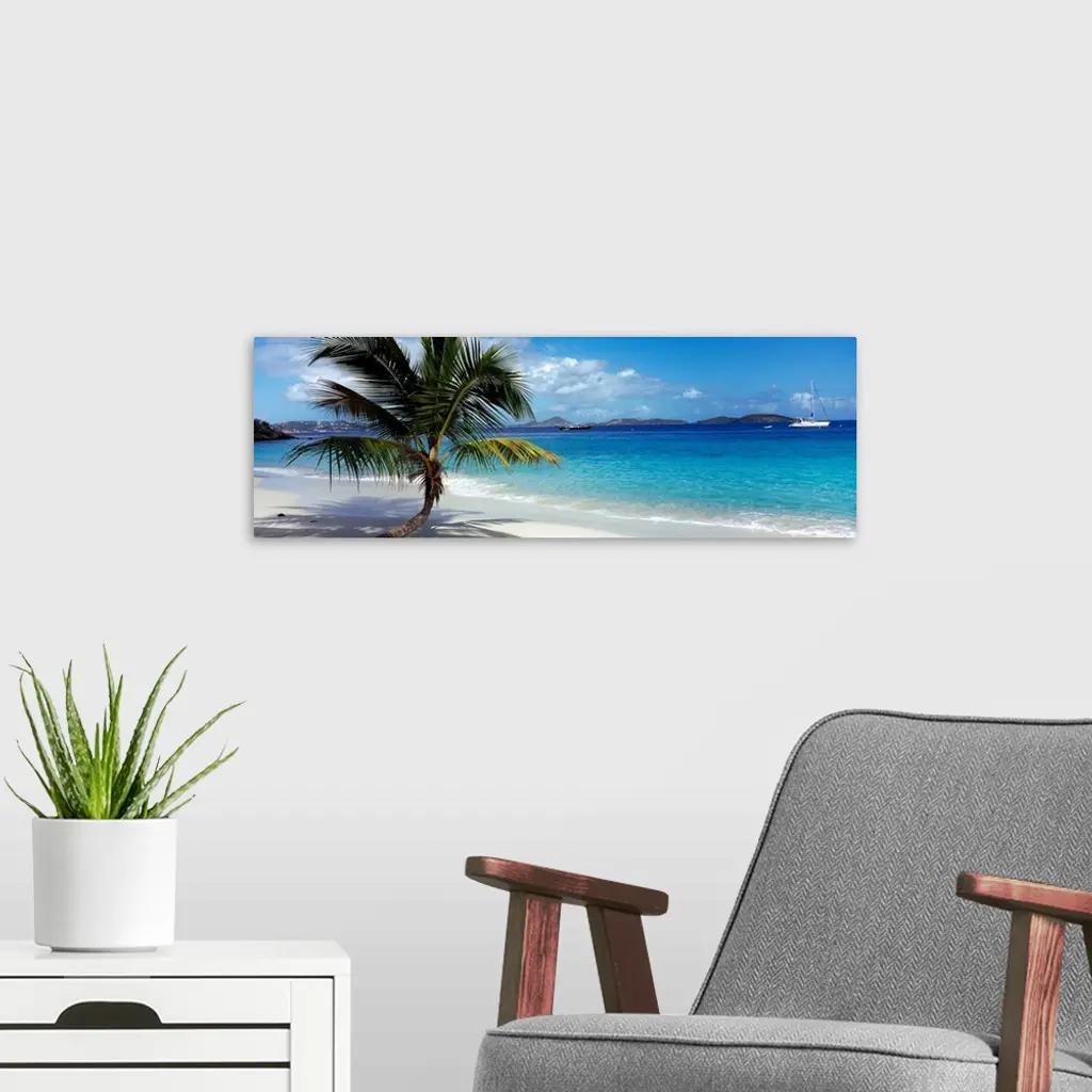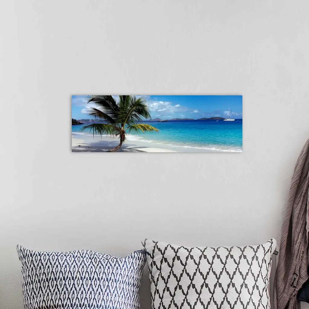 Panoramic photo on canvas of a big palm tree sticking out onto the ocean shore with a sail boat and mountains in the distance.