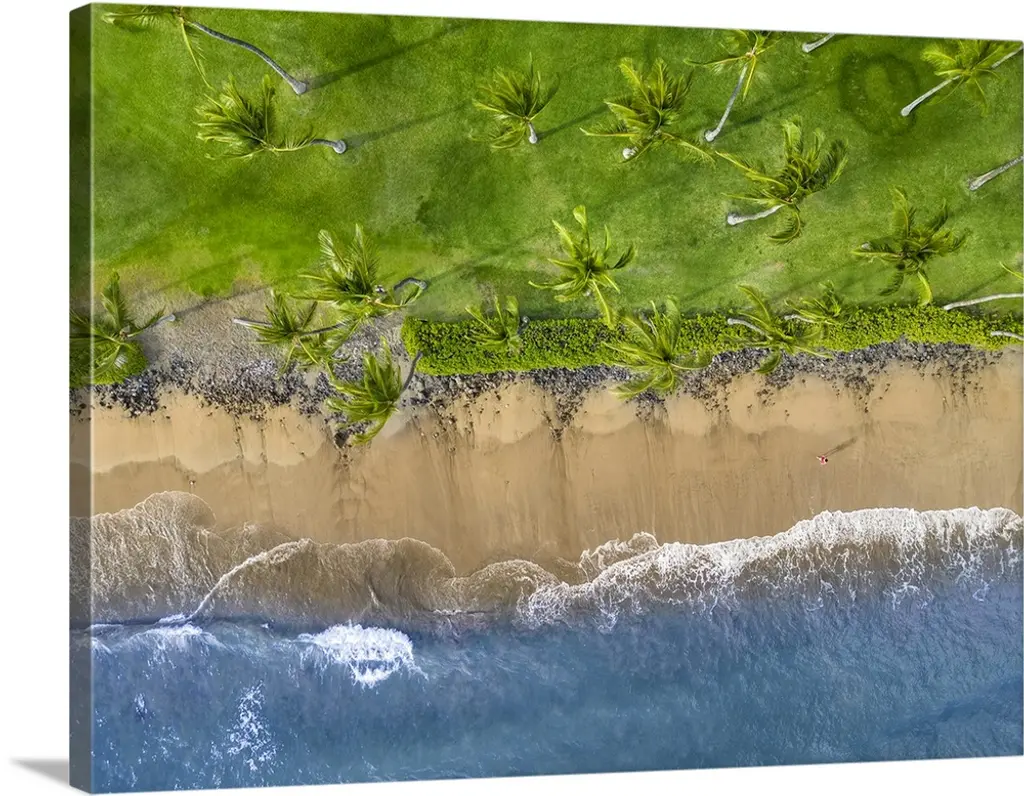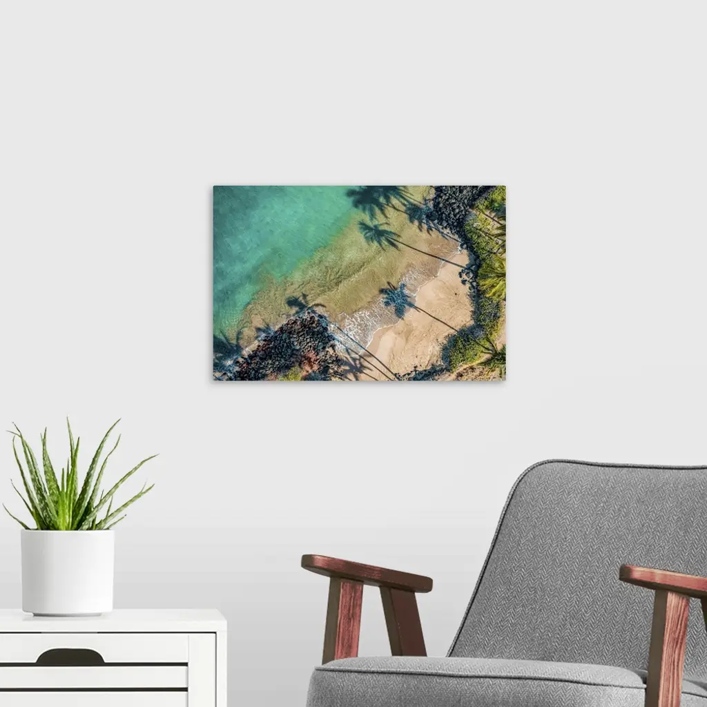 Aerial view of palm tree shadows on the sand of a tropical beach at the water's edge. Kihei, Maui, Hawaii, united states of America.