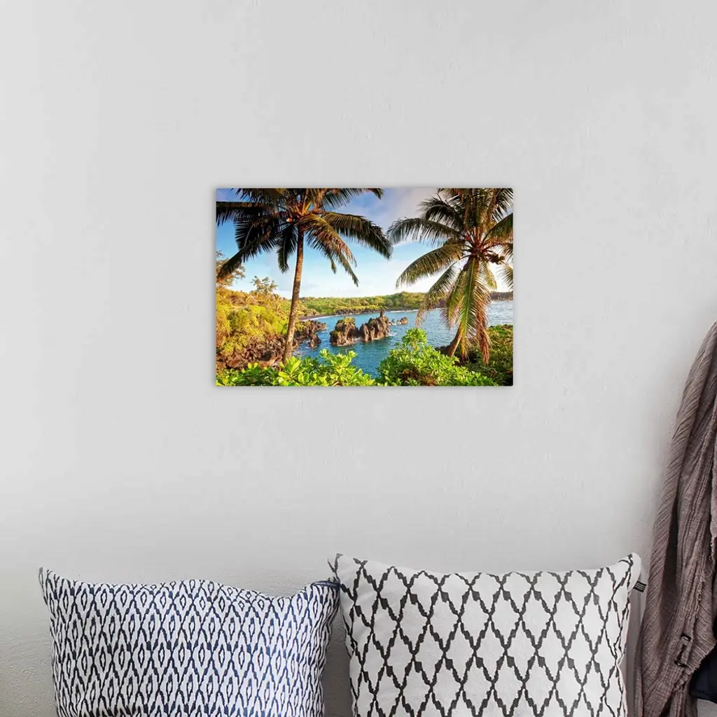 Landscape photograph of two large palm trees swaying over the coastline in Maui, Hawaii. Large rocks in the blue waters at Wainapanapa State Park.