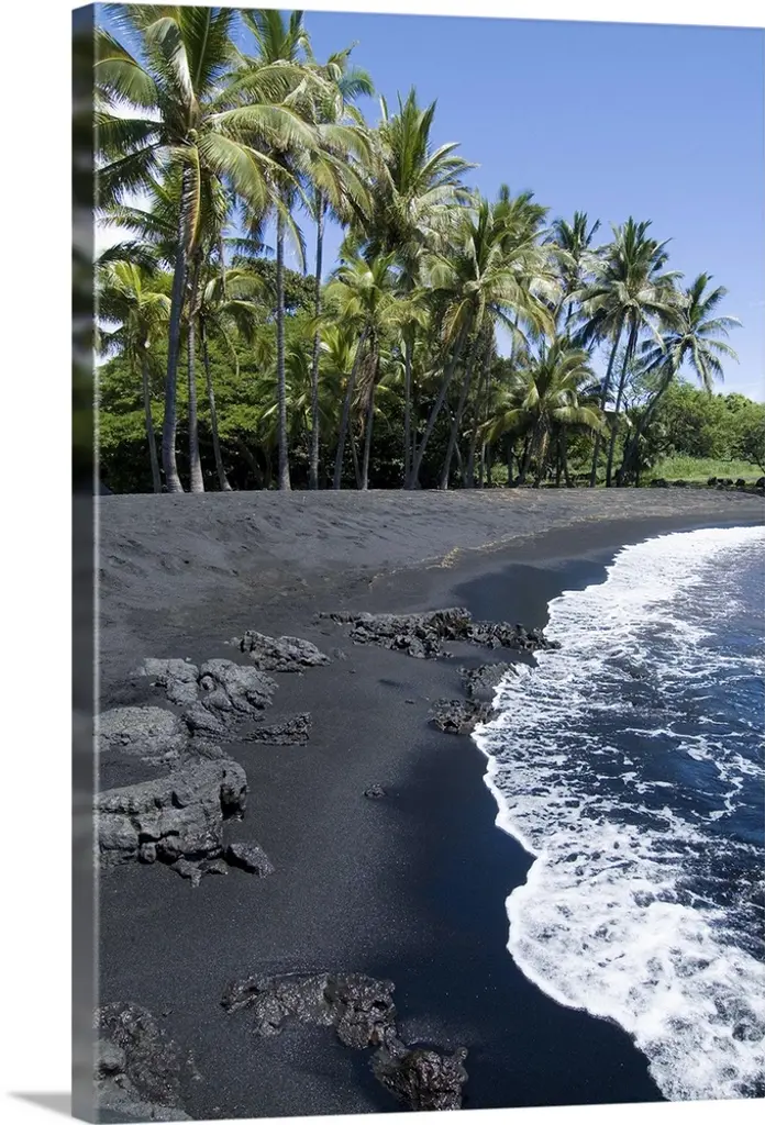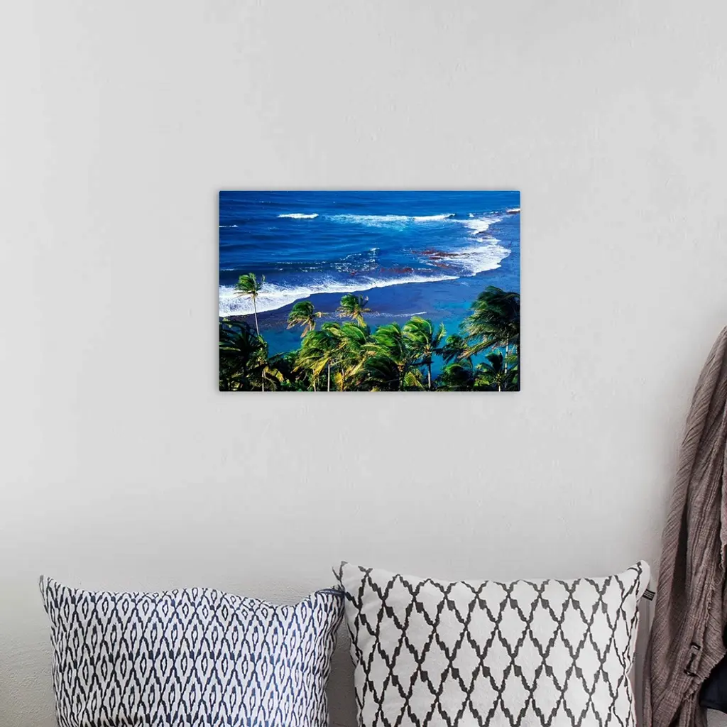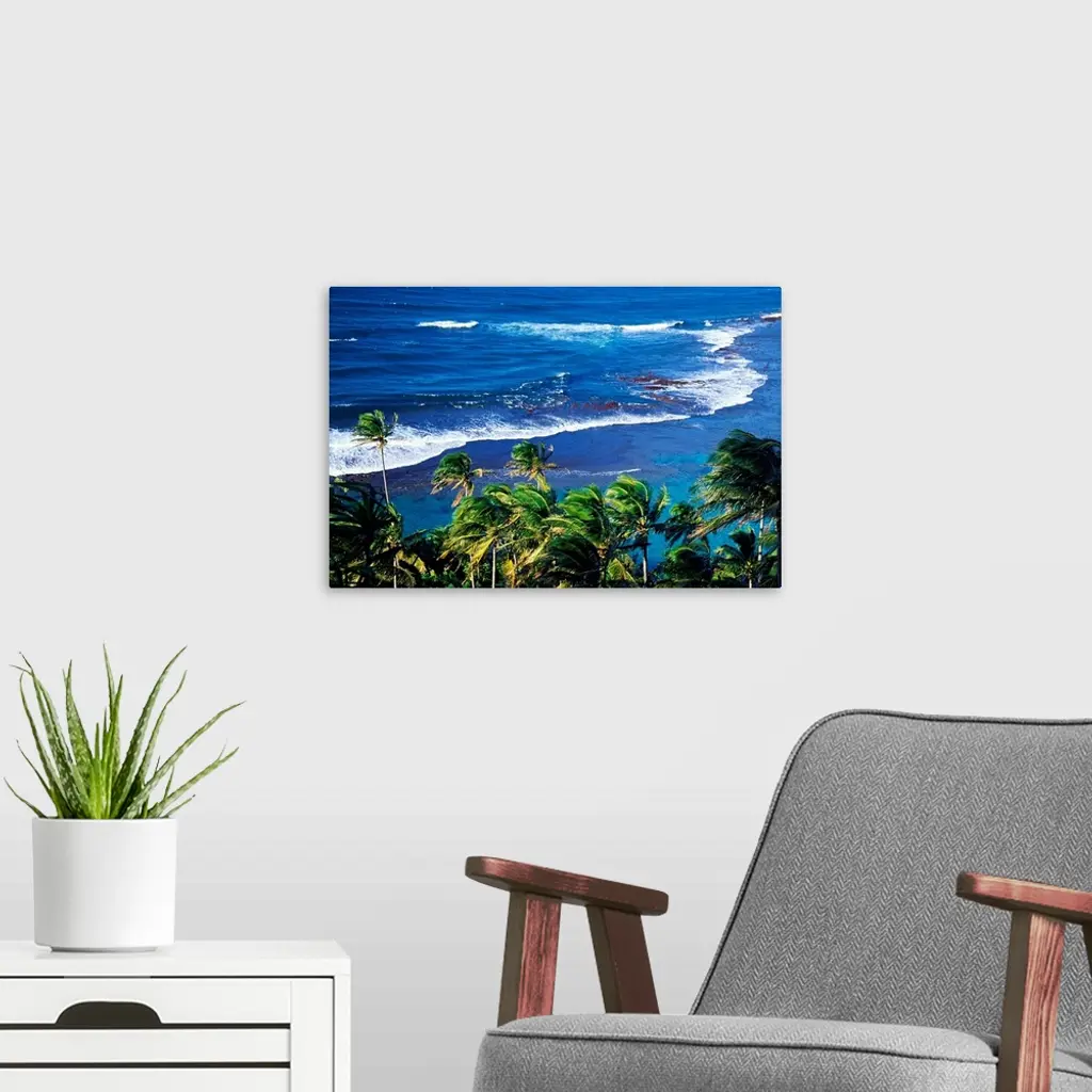 Wall art for the home, office, or beach house this landscape photograph of fronds blowing in the wind and swells breakings against the shore.