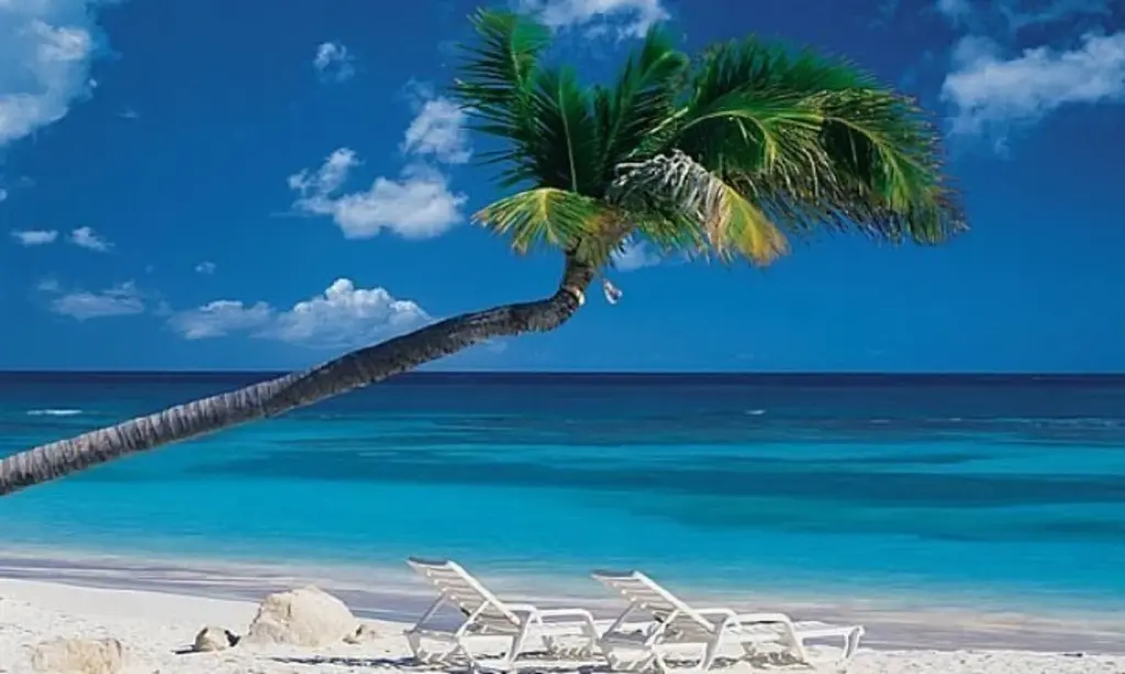 Palm Trees Lean And Cast Shadow On Beach With Turquoise Ocean