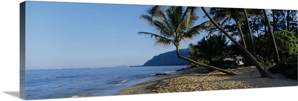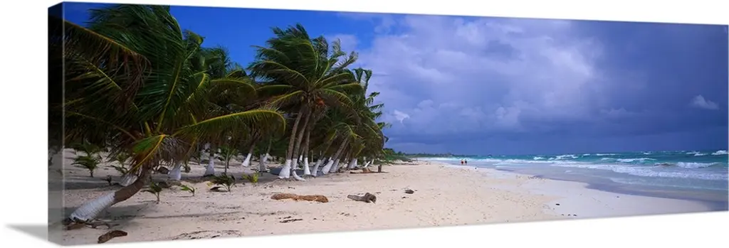 Panoramic photograph shows a group of tropical vegetation hanging over a sandy coastline while the waves of the Pacific Ocean calmly make their way to shore.